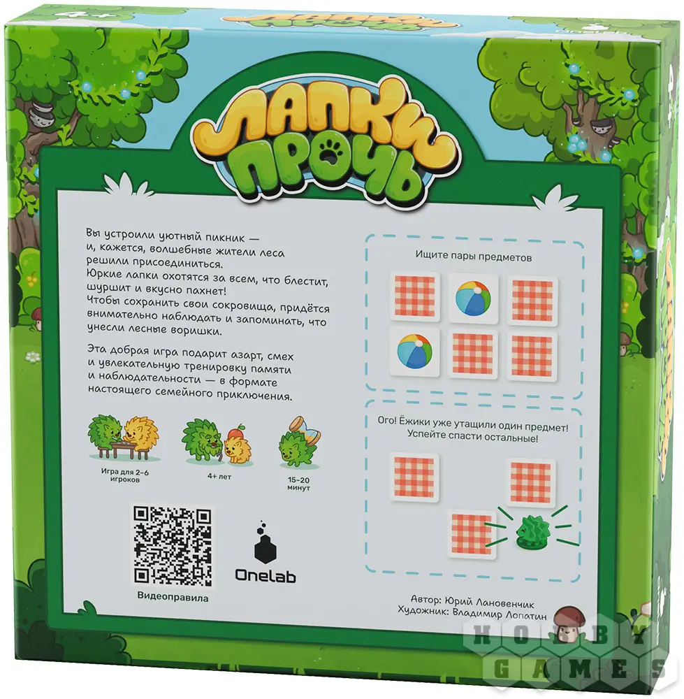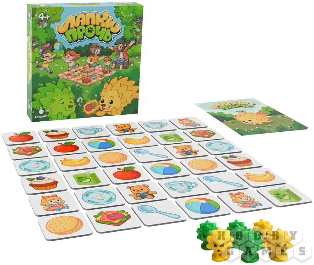 "Лапки прочь" – это развивающий кооператив для детей и их родителей. Здесь все объединены общей целью и вместе пытаются обхитрить шустрых ёжиков. В центре стола квадратом выложены жетоны рубашкой вверх. Вам предстоит по очереди открывать по два из них: если картинки совпали – пара уходит в общую копилку, если нет – жетоны возвращаются на место. Но вот загвоздка – после каждого вашего хода ёжик продвигается вперёд и забирает один из жетонов с поля. Чтобы выиграть, нужно набрать семь пар быстрее, чем их утащат в уютные норки. Удастся ли вам обогнать хитрых воришек?