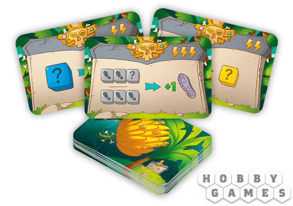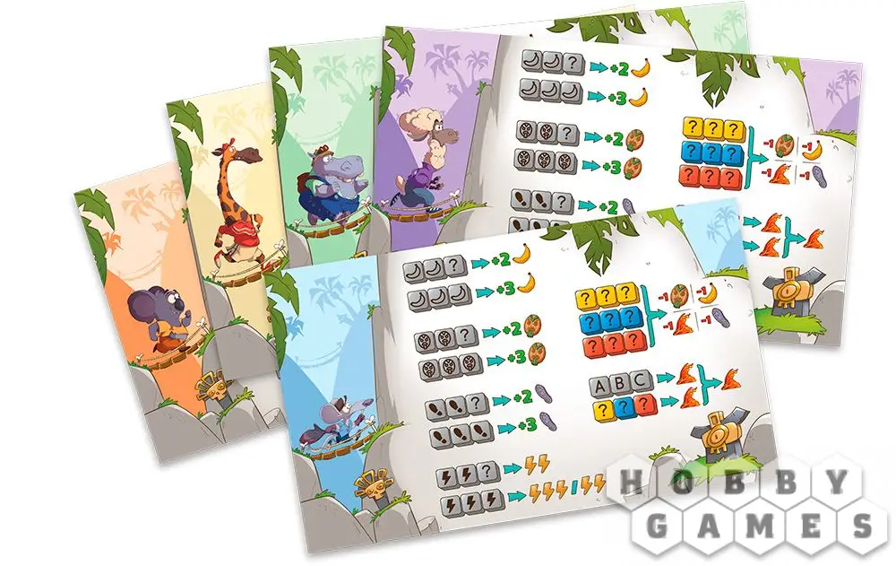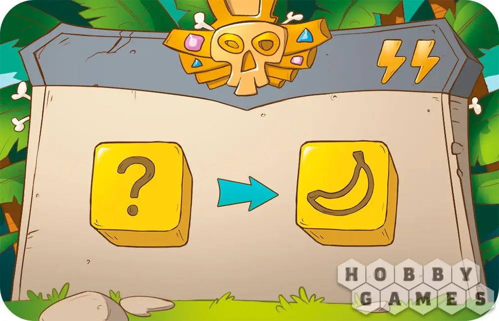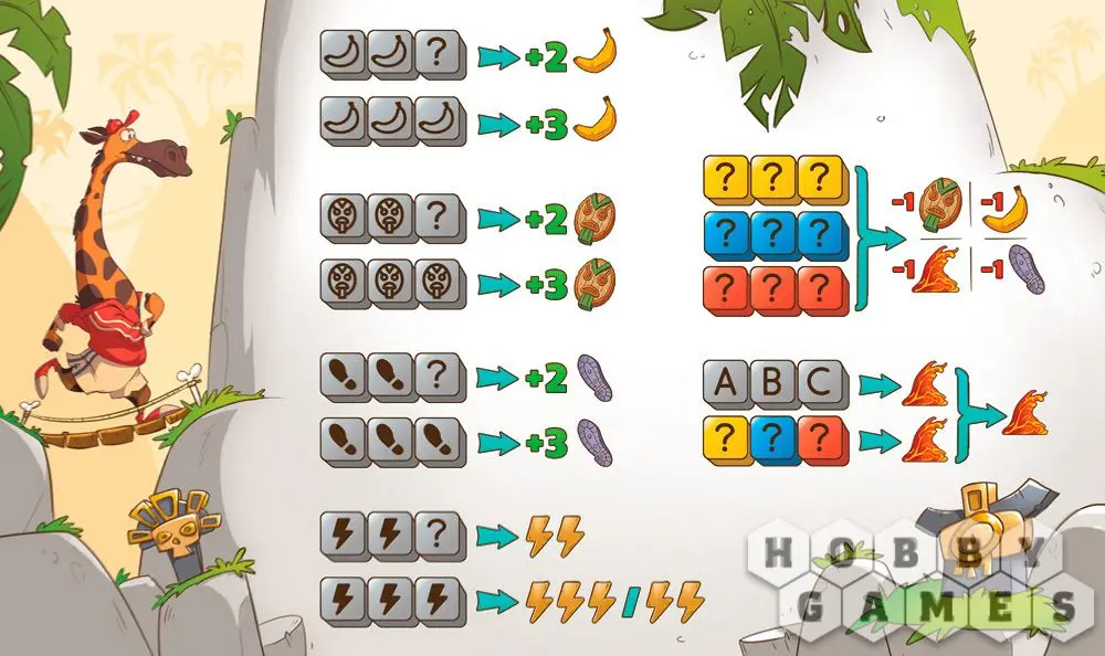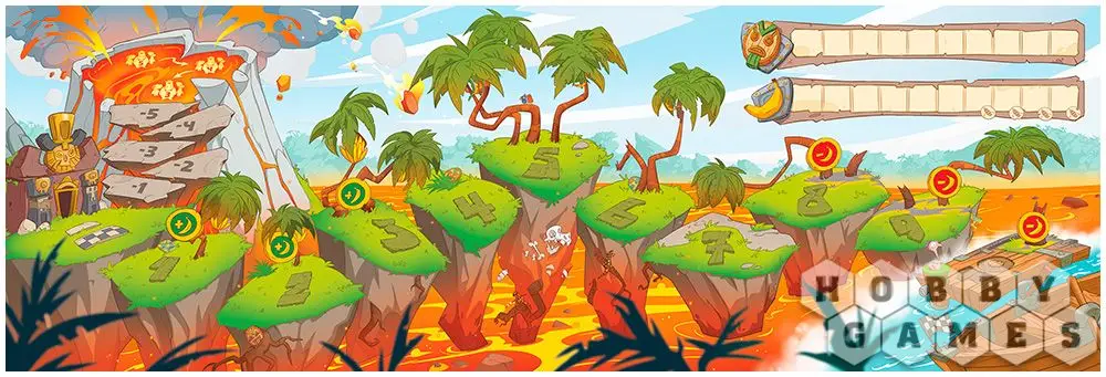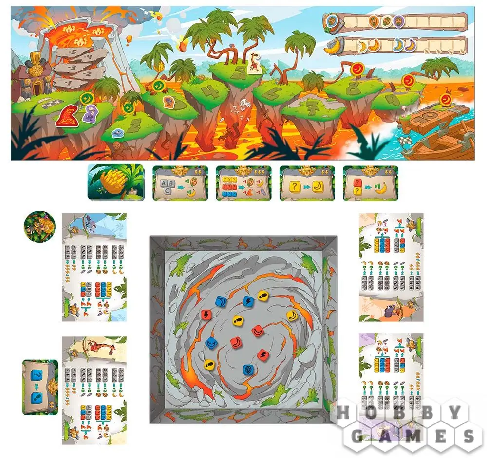 На полученных кубиках наши приключенцы теперь стараются собрать комбинации из двух или трёх одинаковых символов, применяя их по очереди. Одинаковые символы бананов продвигают игроков по счётчику бананов. Если не пройти семь "банановых" клеток, то даже сесть в спасительную лодку не получится. Символы масок дадут вам реликвии, которые и определят победителя, если до лодки смогут добраться несколько перепуганных зверят. Символы перемещения точно так же помогут продвинуть персонажа. А собрав символы молний, можно приобрести карты действий, которые позволяют применять всевозможные эффекты во время бегства от лавы. Так, например, можно поменять символы на кубиках, получить бананы, защититься от уловок и даже спастись от последствий ловушек!