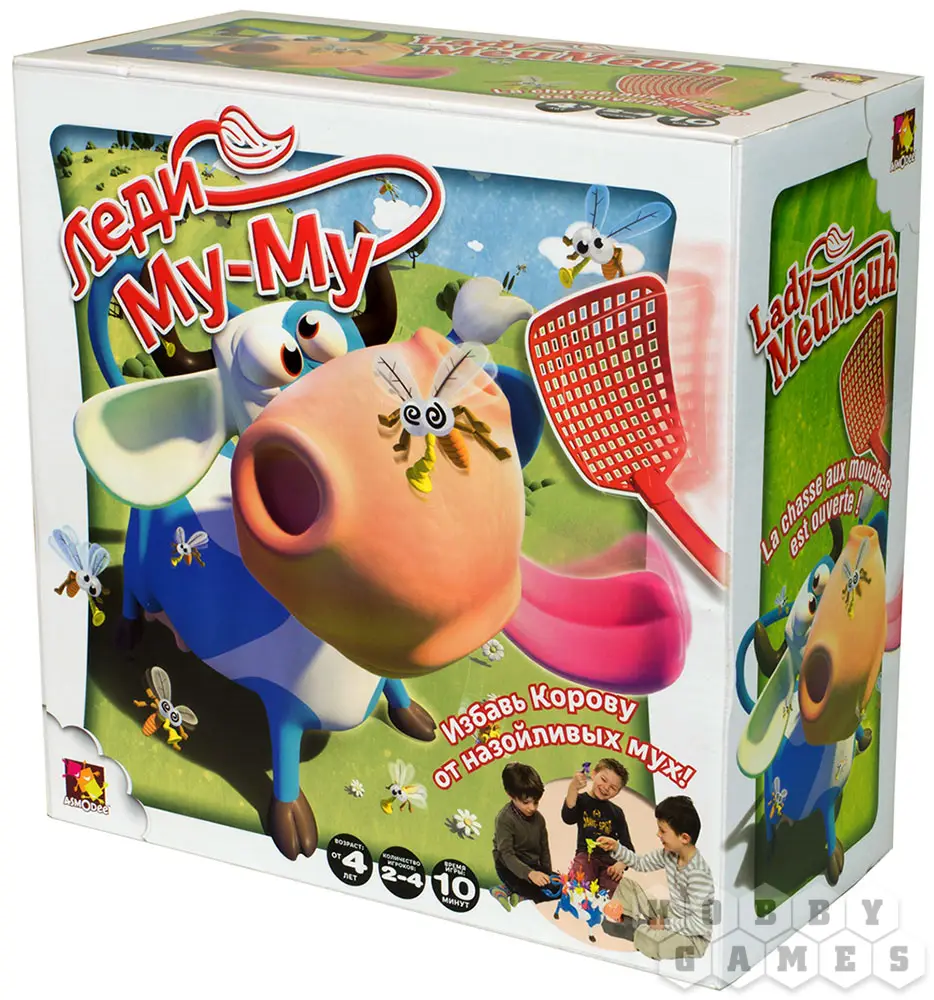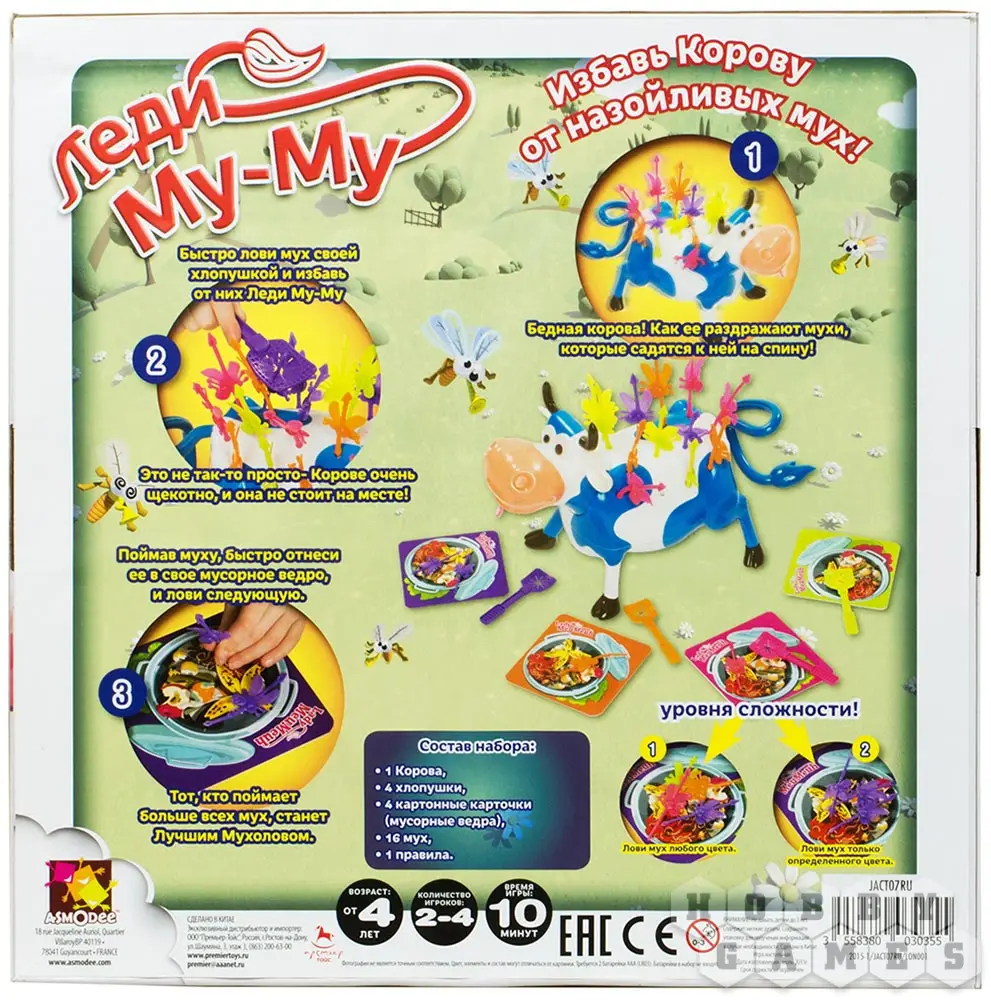 В коробке с игрой вы найдёте фигурку Коровы и несколько пластиковых мух, которых нужно будет расположить на спине Леди Му-Му. Игроки должны быстро ловить мух своими хлопушками. Сделать это будет непросто, ведь Корове щекотно и поэтому она не стоит на месте! Когда муха поймана, игрок должен быстро отнести её в своё мусорное ведро и скорее ловить следующую. Тот, кто наловил больше всех мух, объявляется победителем.