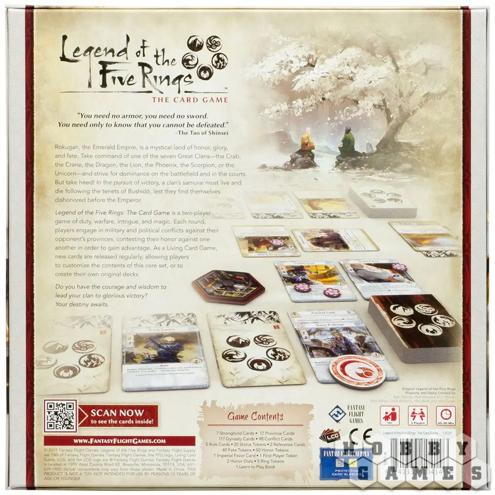 Legend of the Five Rings: The Card Game — живая карточная игра для двух игроков, которым придётся примерить на себя роль одного из семи Великих Кланов Рокугана. Вам предстоит бороться за военный и политический контроль над землёй, сохраняя строгий кодекс чести Рокуганского общества.