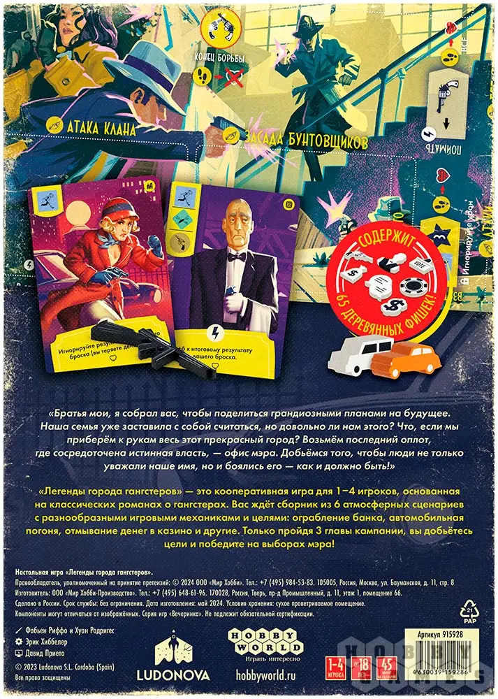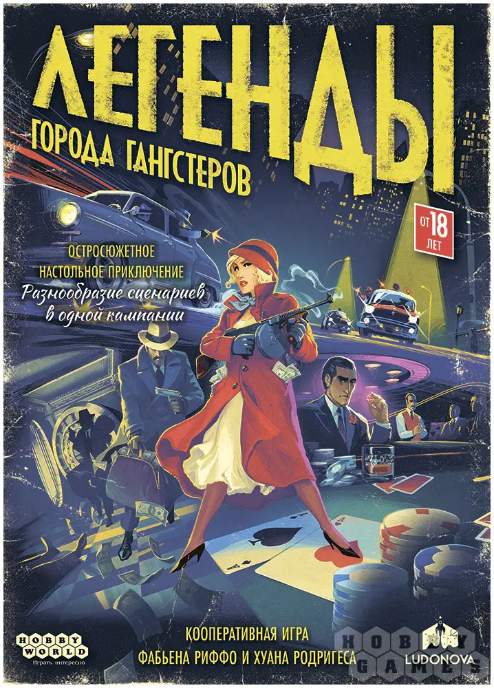 "Легенды города гангстеров" – это кооперативная настольная игра, в основе которой лежат классические истории о гангстерах прошлого столетия. 6 атмосферных сценариев, в каждом из которых не только различные механики, но и задачи, заставят вас почувствовать себя настоящим членом мафии. Вам предстоит ограбить банк, принять участие в автомобильной погоне, отмыть деньги в казино и многое другое. Но всё это лишь маленькие кирпичики, по которым вы будете взбираться на вершину, пока не достигните истинной власти, заняв кресло мэра. И чтобы добиться этой цели, вам нужно успешно пройти 3 сценария.
