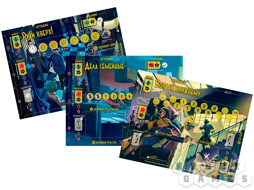 Сценарии имеют особые указания, поэтому подготовка к игре будет незначительно меняться от партии к партии. Это вполне логично: вряд ли гангстеры придерживались одного и того же плана готовясь к разным делам. На столе находятся планшет сценария, колоды карт клана и проблем, кубики и фишки. Вы начинаете игру с 3 картами приспешников на руках – у каждого высоко стоящего члена клана должны быть подручные для решения проблем. А без них, кстати, не обойтись: в начале раунда первый игрок открывает одну карту из колоды проблем и кладёт в открытую перед собой. Она обязательно будет мешать вашим замыслам, поэтому лучше разделаться с ней поскорее...