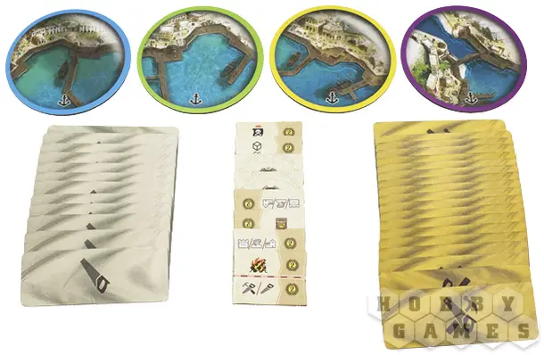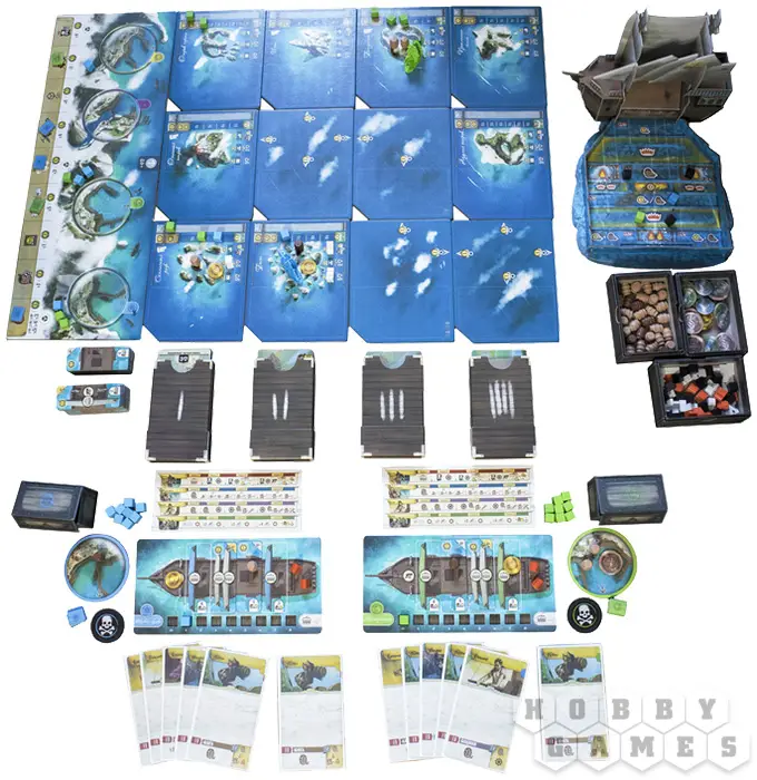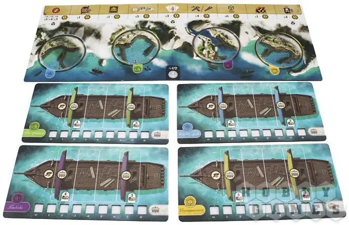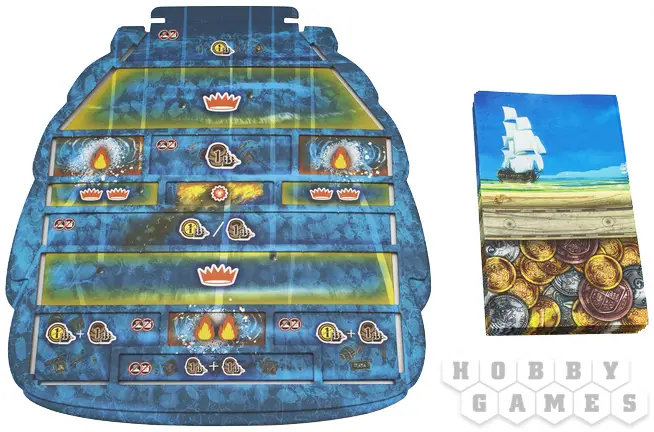 По мере продвижения вы будете совершенствовать корабль: увеличивать скорость, расширять трюмы и усиливать боевые качества. Команда тоже растёт вместе с вами – персональная колода карт открывает уникальную механику развития, позволяя переворачивать карты прямо в протекторах и добавлять новые навыки. Захват островов приносит товары, а построенные на них здания укрепляют ваши позиции и открывают дополнительные возможности. В морских боях всё решают броски кубиков: вас ждут схватки с другими капитанами и столкновения с торговыми судами, где риск и удача идут рука об руку.