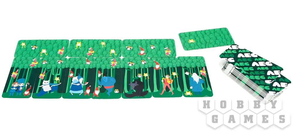"Лес" – это простая и быстрая карточная настольная игра для детей и их родителей. Она поможет ребёнку развить навык счёта, наблюдательность и умение строить правильную тактику. Карты в колоде представляют собой стволы и кроны деревьев волшебного леса, на которых изображены различные существа: феи, лягушки, совы и гномы. На каждой карте они могут быть изображены в любом составе и в любом количестве. В начале игры каждый игрок получает на руки 3 карты, а оставшиеся образуют общую колоду. Первый игрок выкладывает любую свою карту, таким образом начиная лес. Затем снимает карту из общей колоды, чтобы на руках вновь было 3 карты. Далее ход передаётся следующему игроку по часовой стрелке. Нужно внимательно следить за быстро разрастающимся лесом, ведь как только в нём появятся 7 (или больше) существ одного вида, нужно первым назвать, что это за существа! Игрок, кто первым выполнит это условие, забирает из леса все карты с этими существами – они кладутся взакрытую перед игроком и являются его победными очками. Игра длится до тех пор, пока в колоде и на руках у игроков не закончатся карты. Самый внимательный и быстрый игрок, собравший больше всех карт, становится победителем.