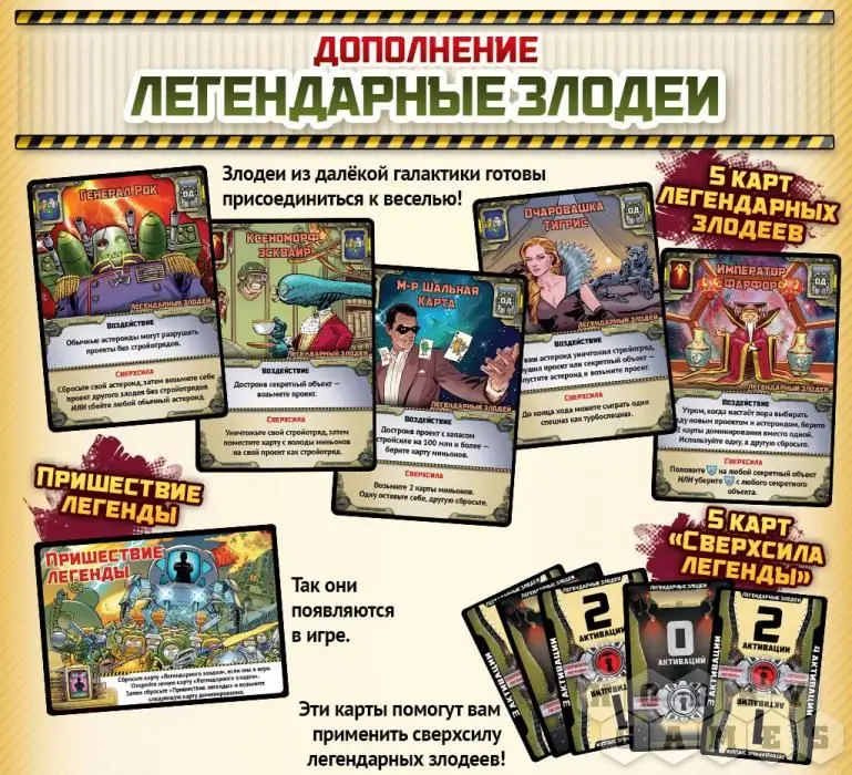Каждая карта легендарного злодея - интерактивный игровой режим. Каждый легендарный злодей меняет правила, а тем временем игроки применяют его сверхсилу для злодейств и получают пользу благодаря приветствию, которое выполняется, когда он входит в игру!