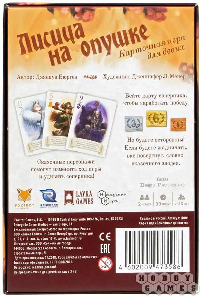 "Лисица на опушке" – это игра на взятки для двух игроков. Используйте специальные способности сказочных персонажей, которые есть у карт помимо масти и значения, для того чтобы изменить козырь или всячески повлиять на игру. Масти в игре не простые – это звонки, ключи и луны, а значения идут от одного до одиннадцати, что в сумме даёт тридцать три сказочных персонажа в великолепном карточном оформлении.