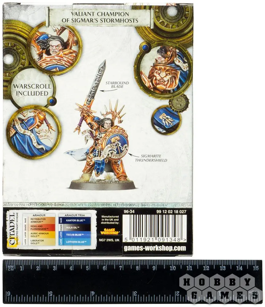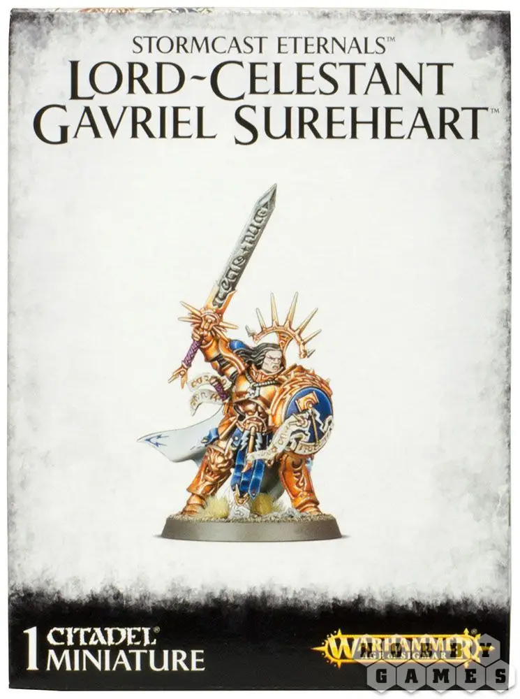 Этот многокомпонентный пластиковый набор содержит детали, необходимые для сборки миниатюры лорда-целестанта Гавриэля (Gavriel Sureheart, a Stormcast Eternals Lord-Celestant). Гавриэль облачен во внушительно громоздкие доспехи грозовых воинов, но от собратьев его отличает отсутствие шлема, являющее суровое выражение лица и длинные развевающиеся волосы. Он вооружен покрытым рунами звездным клинком, оружием длиной в человеческий рост, и сигмаритовым громовым щитом, больше похожим на круглый щит гвардейца Дракотианской Гвардии, нежели на щиты других лордов-целестантов. Поверхность доспеха от наплечников до резных поножей полностью покрыта геральдикой Сигмара.