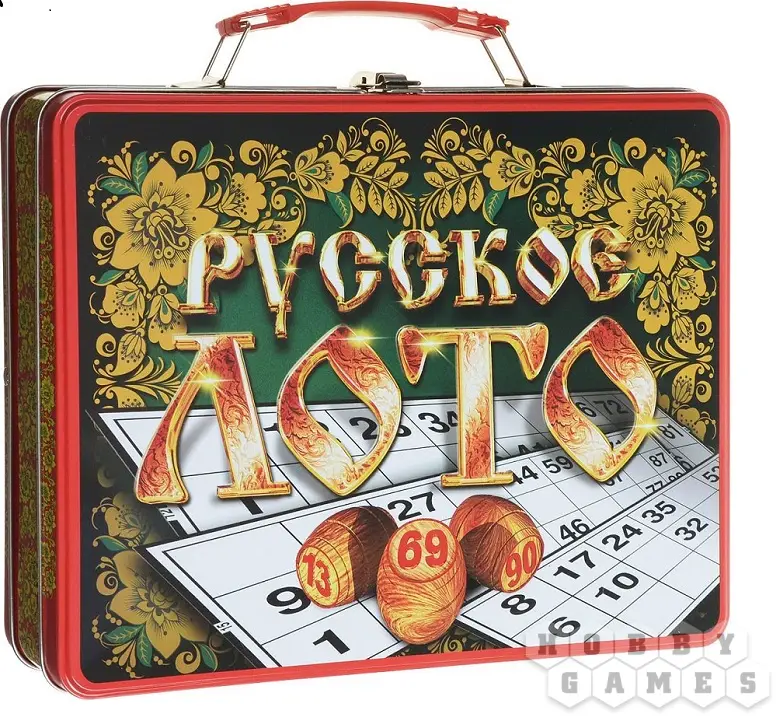 Одно из наших лучших лото. Вместительный чемоданчик из жести с ручкой удобен как для переноски, так и для длительного хранения игры. Традиционные узоры напоминают о том, что это действительно «Русское лото», а не какое-то там «Бинго».