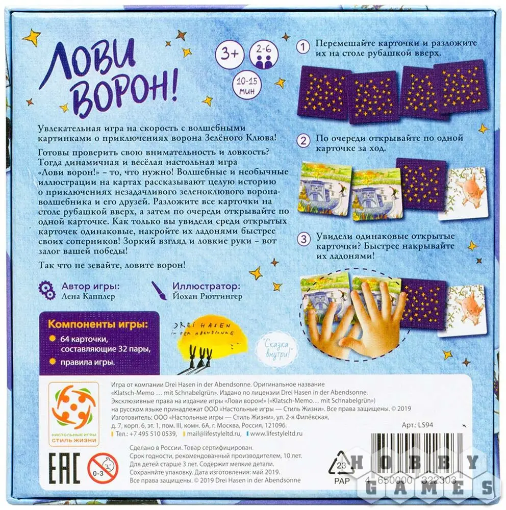 "Лови Ворон" – это настольная игра для всей семьи с механикой "Мемори". Эта игра интересная и, что немаловажно, удивительно полезная! Вечер в большой или маленькой компании с такой игрой пролетит незаметно! Наверняка вы станете поклонником игр "Мемори", сыграв всего лишь раз.