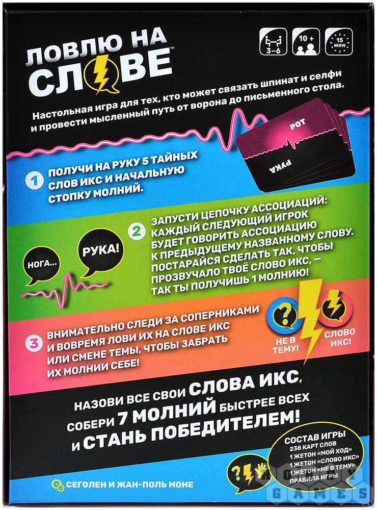 "Ловлю на слове" – это настольная игра, в которой вам нужно будет выстраивать цепочки ассоциаций, при этом внедряя в них свои "икс-слова" так, чтобы никто не заподозрил подвоха. Сможете, и получите молнию, а это крайне полезно, ведь итоговая цель – собрать 7 молний! Внимательно наблюдайте за соперниками и не стесняйтесь подлавливать их на слишком очевидной смене темы и попытке внедрить своё слово икс – так вы сможете украсть их молнии и ещё быстрее приблизиться к победе!