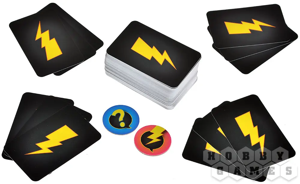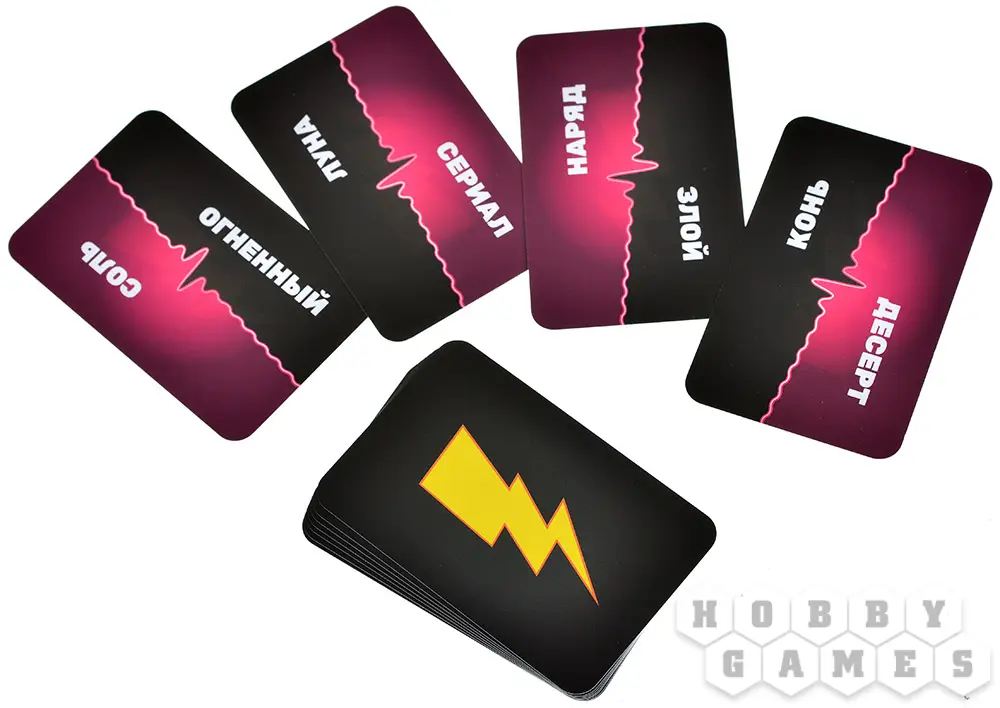 Каждая карта разделена на две половины: розовую и чёрную, а на обороте изображена молния. Для начала определитесь, какой цвет вы будете использовать. Затем раздайте игрокам по 5 карт и набор из 3 молний. Слова, написанные на выбранном цвете, и будут вашими словами-икс. Затем раскройте верхнюю карту колоды – это начало вашем ассоциативной цепочки.
