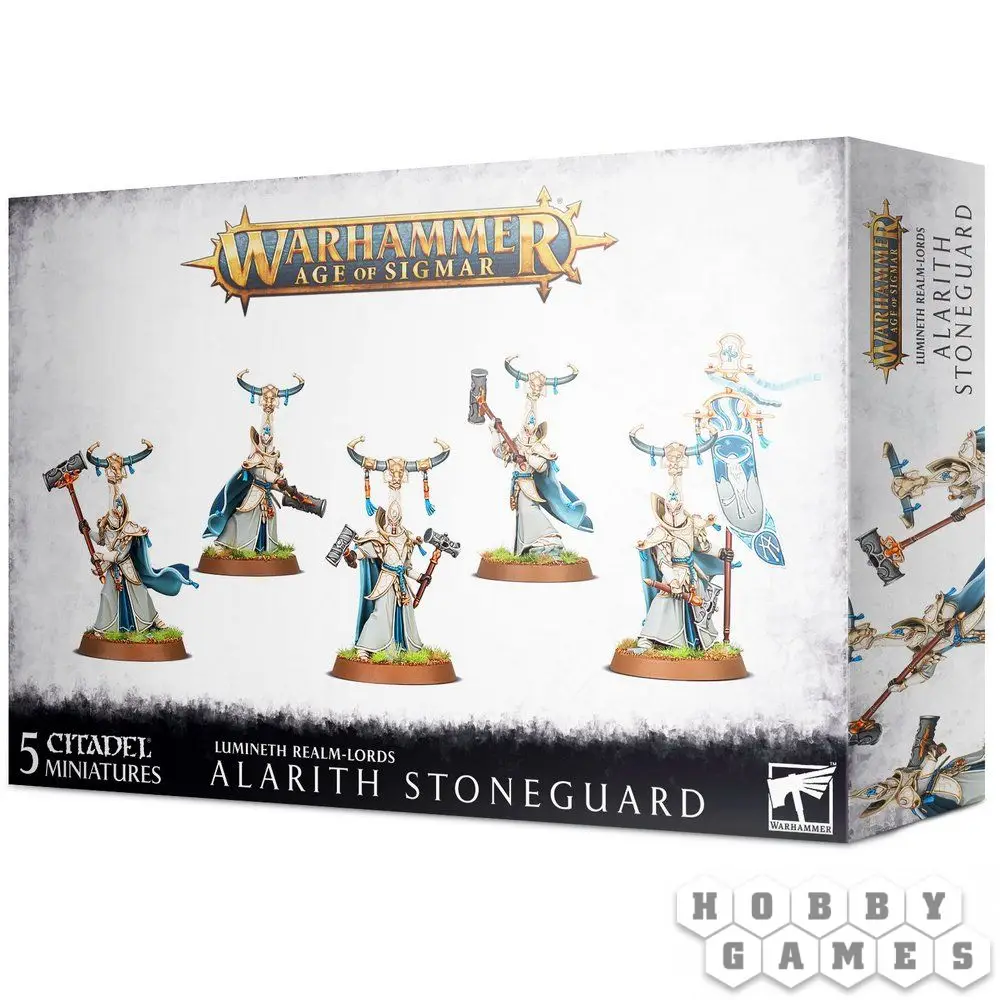 Набор позволит вам собрать 5 миниатюр Каменных стражей Аларита, включая опции для Знаменосца (Standard Bearer) и Сенешаля Камня Истины (Truestone Seneschal). Каждого из Каменных стражей можно вооружить, по вашему выбору, каменным молотом (stone mallet) или алмазным отбойником (diamondpick hammer). Сенешаль Камня Истины может использовать пару стратумных молотов (stratum hammers). Набор включает 63 пластиковые детали и пять 32-миллиметровых подставок.