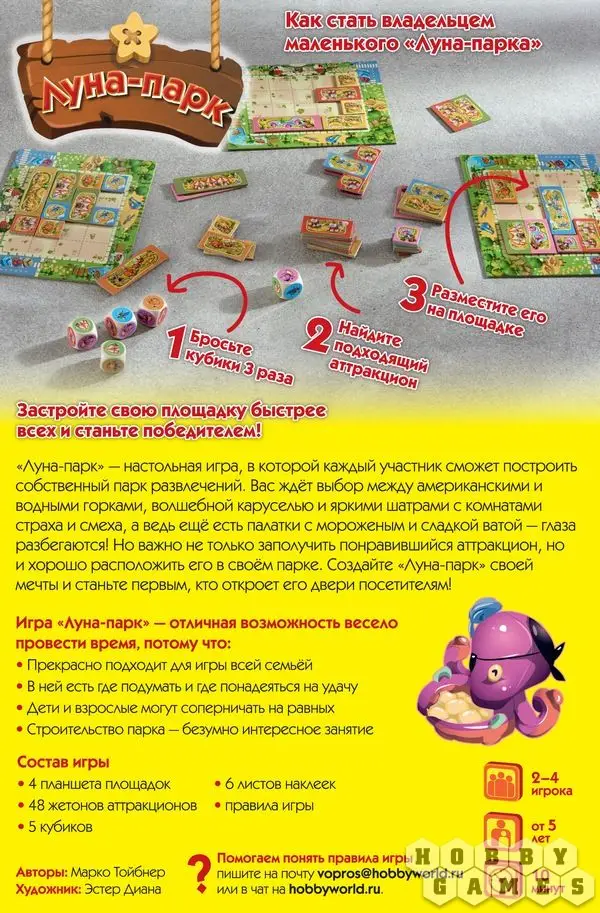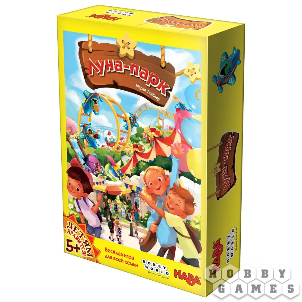 "Луна-парк" – это отличная семейная настольная игра для четырёх игроков, в которой фактор удачи важен настолько же, насколько и принятие собственных игровых решений. Игра проста в освоении и прекрасно поможет развить детям пространственное мышление, счёт и мелкую моторику.