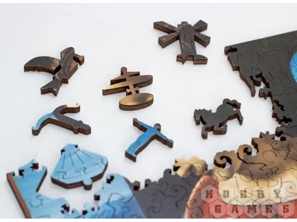 форма каждого элемента пазла индивидуальна, это могут быть птицы, рыбы, здания, люди в зависимости от темы сюжета, они не повторяются, создавая уникальные сочетания;