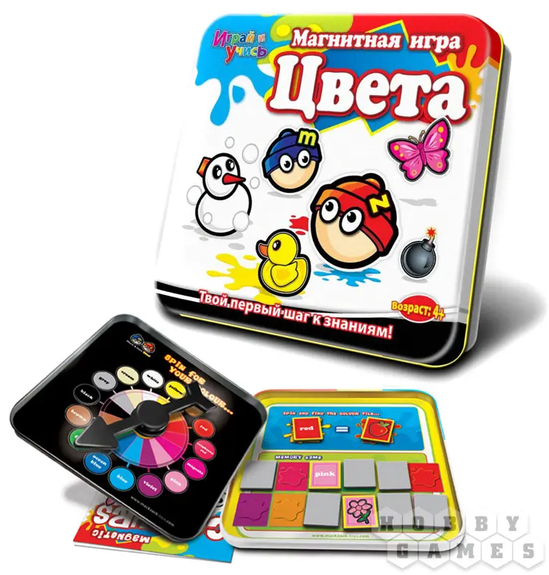 Вооружившись волчком и красочными магнитами, входящими в комплект, ребенок отправится в увлекательное путешествие по волшебной стране цветов и оттенков. Помимо основных – желтого, красного, синего, зеленого, белого и черного, игра научит отличать разнообразные тона – розовый, фиолетовый, голубой, серый и т. д.
