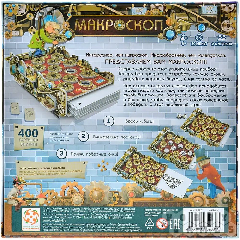 "Макроскоп" – это необычная игра на внимательность и воображение, в которой вам предстоит угадывать засекреченные изображения, используя лишь крупицы информации. Игра развивает логику, умение анализировать и собирать разрозненное малое в полноценное общее. В коробке вас ждут целых 400 картинок, и каждая из них обещает стать настоящим вызовом! Простой геймплей, захватывающий процесс и динамичные раунды делают игру интересной как для детей, так и для взрослых. Открывайте окошки макроскопа, угадывайте картинки и зарабатывайте победные очки за правильные догадки. Игра подойдёт для дружных семейных вечеров или встреч с друзьями.