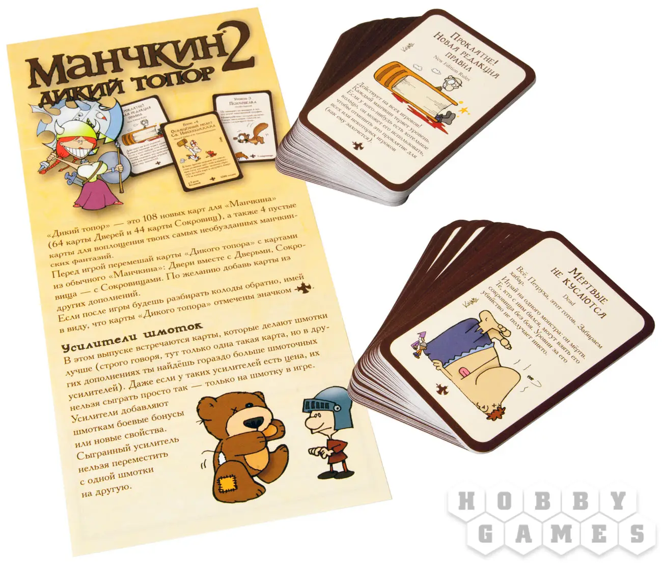 "Манчкин 2 Дикий топор" добавляет свирепых Орков к расам первой части. Эти получудища умеют избегать Проклятий, а также получают дополнительный уровень при подавляющем превосходстве в бою. Ещё 112 карт для профессионалов погони за монстрами, шмотками и уровнями!