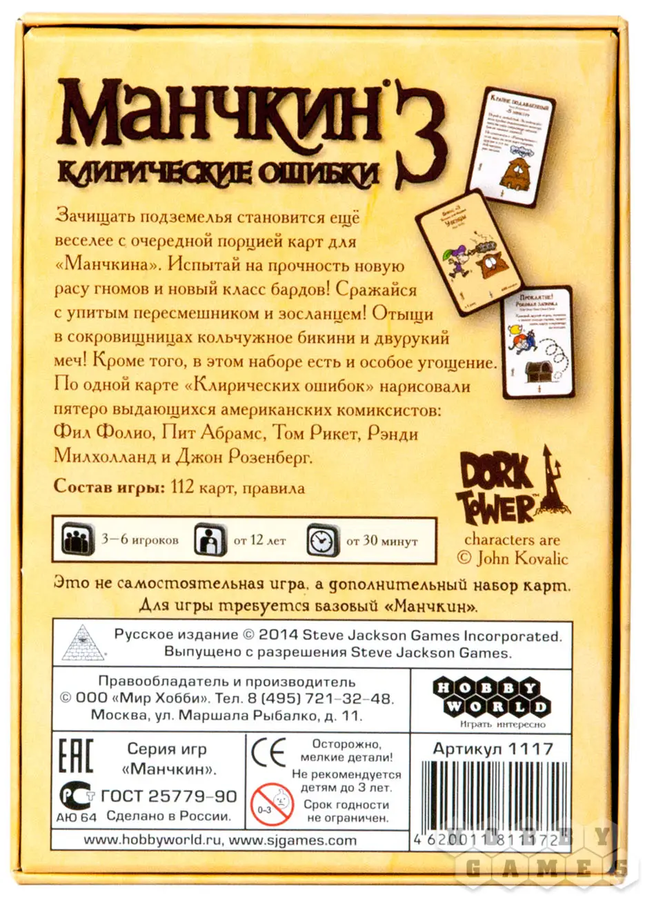 Перед Вами третья часть знаменитого "Манчкина" Стива Джексона! С новыми цветными картами нести веру в Св. Манчкина во все подземелья стало ещё интересней! "Манчкин 3: Клирические Ошибки" порадуют Вас новыми монстрами, за которых можно получить новые крутые шмотки, классами и расами в виде Гнома и Барда и целой кучей новых дверей.