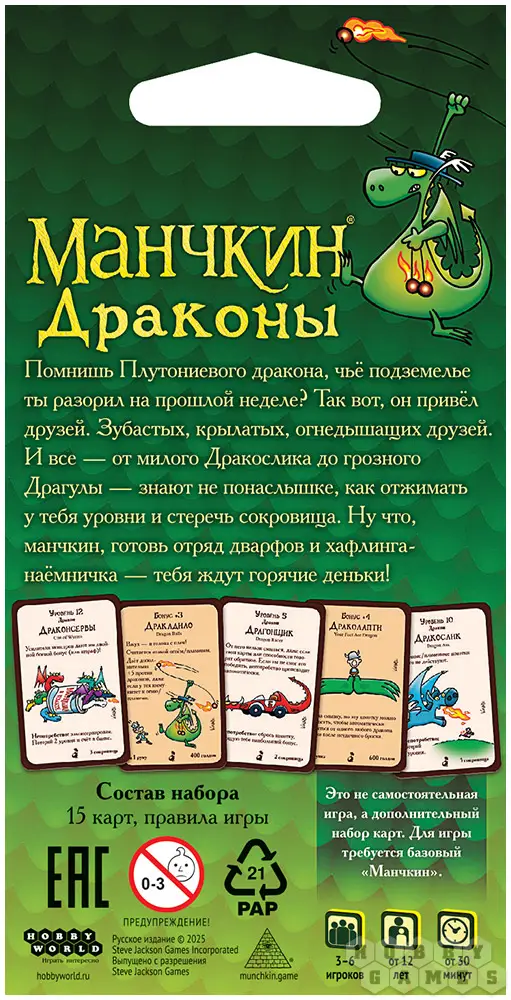"Манчкин. Драконы" – это небольшое тематическое расширение для классического "Манчкина", однако никто не запретит вам добавить драконов в любой из доступных сеттингов! Драконы в космосе или на пиратском корабле? Почему бы и нет?! Чем больше вакханалии, тем лучше, да?
