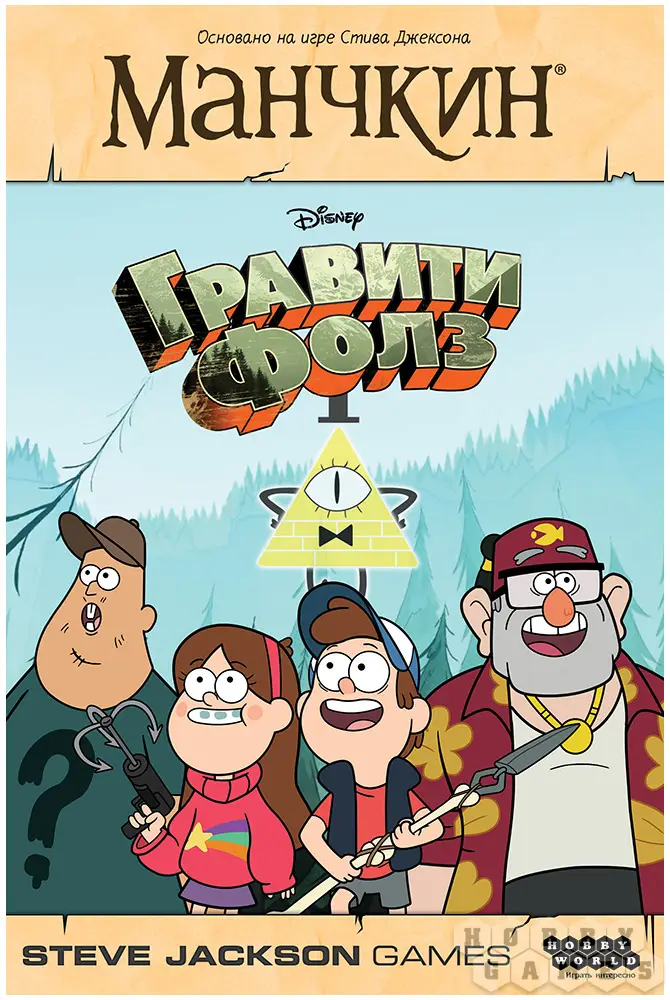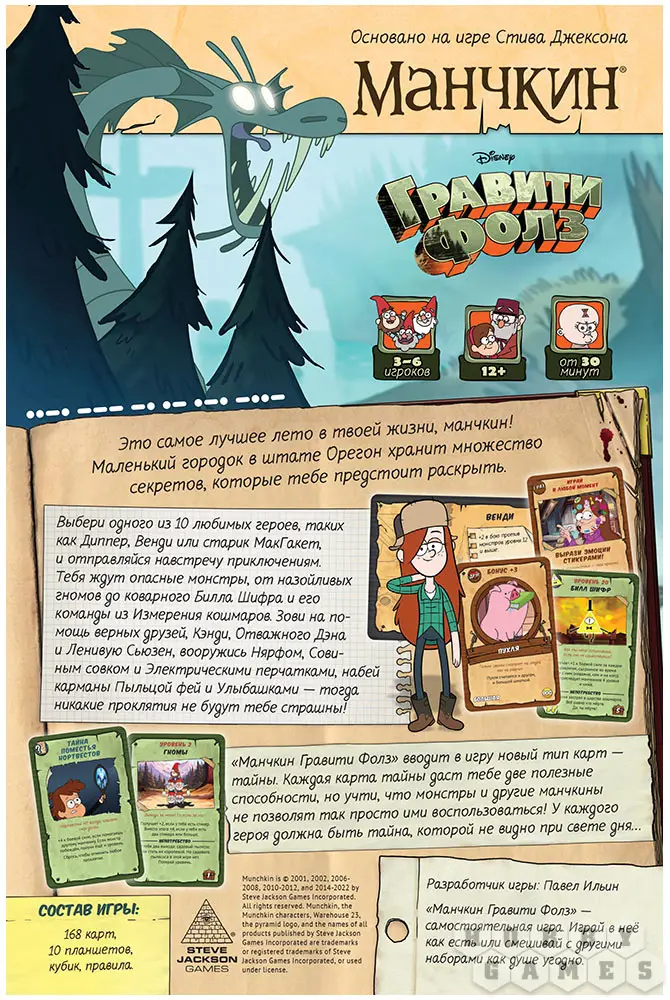 "Манчкин: Гравити Фолз" – это новая игра из легендарной серии "Манчкин", посвящённая любимому миллионами детей и взрослых мультсериалу про приключения близнецов Пайнс. Захолустный городок, затерянный где-то в орегонских лесах, хранит множество тайн. Раскройте их все! Выбирайте, кем играть: гениальным Диппером, неунывающей Мэйбл, неуклюжим Зусом или другими персонажами мультика, зовите на помощь Ленивую Сьюзен или других союзников, вооружайтесь Совиным совком и запасайтесь Пыльцой фей. Вселенная Гравити Фолз готова открыть вам свои новые грани!