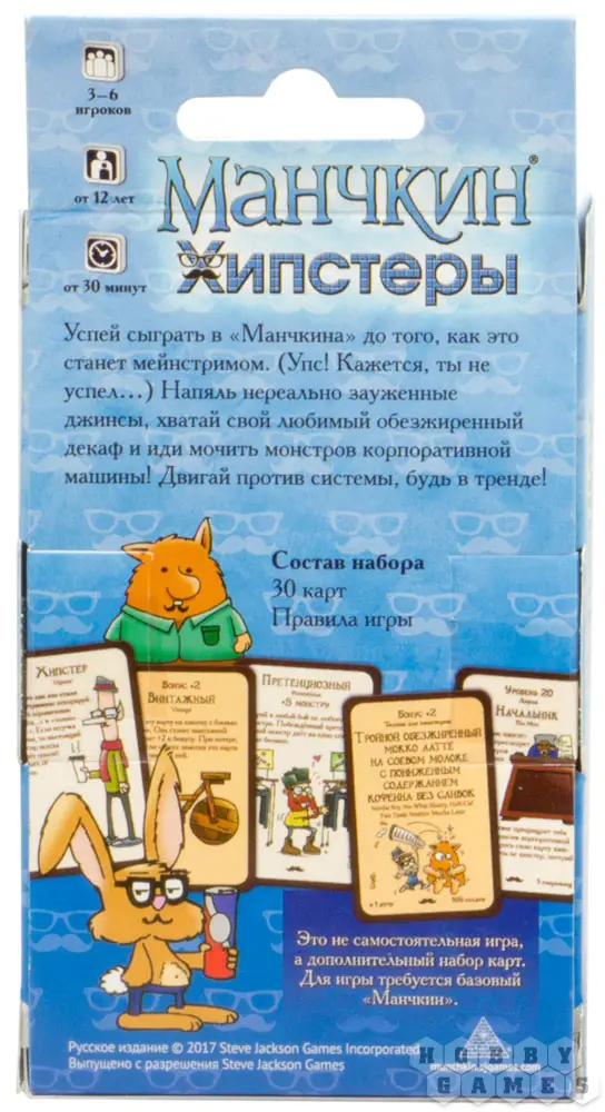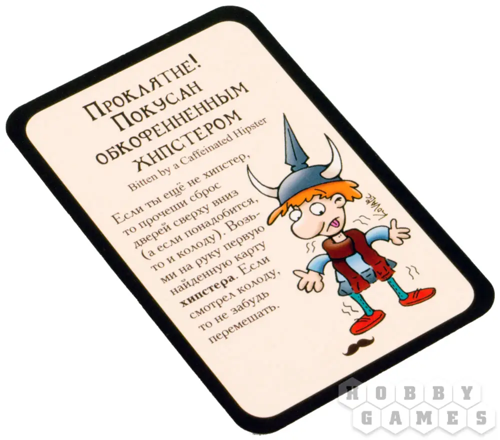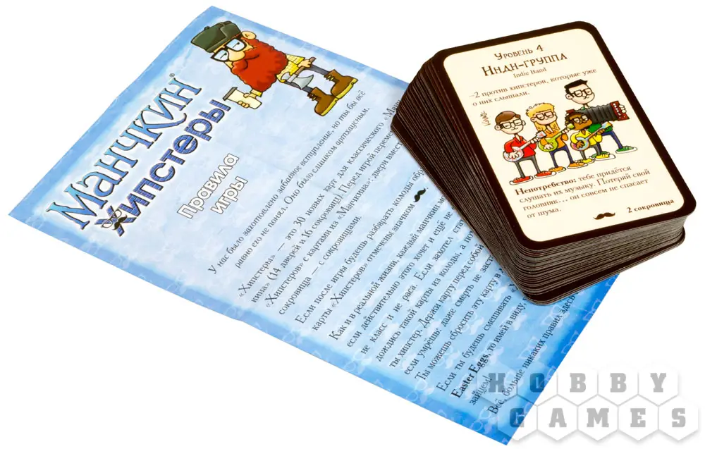 Внутри вы найдёте 30 новых карт – 14 карт дверей и 16 карт сокровищ с потрясающими артами. Готовьтесь встретить новых монстров, например, "Инди-группу"; новые шмотки (успокоим, "Свитер" в наборе есть). Помимо этого, игра предлагает вам возможность самим очутиться в коже хипстера! Он способен игнорироваться любые ограничения на шмотках! Если шмотка модная, то настоящий хипстер найдёт способ пустить её в дело!