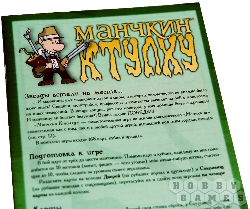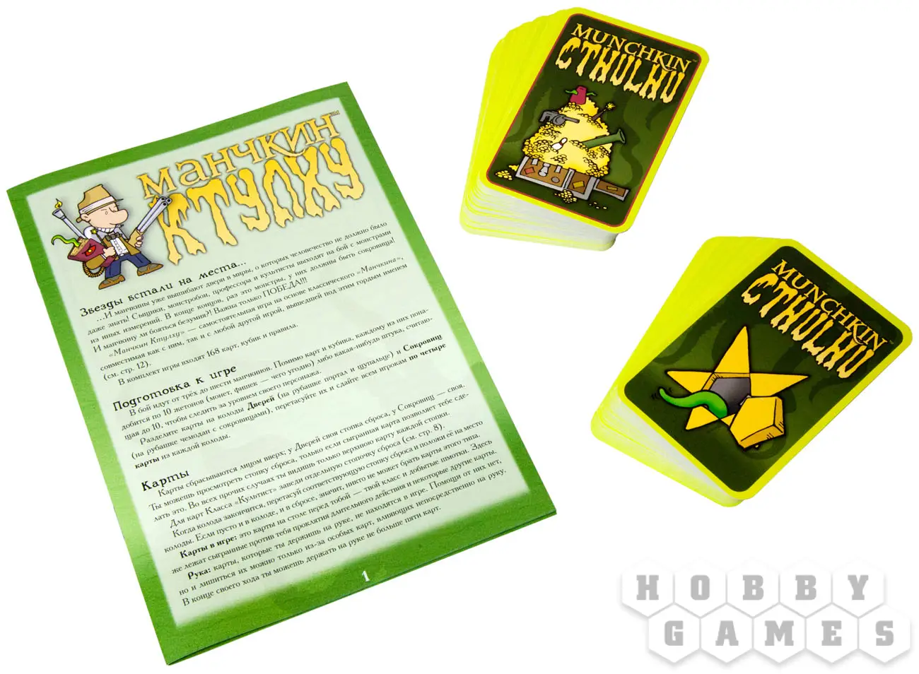 Настольная игра "Манчкин Ктулху" – это очередная пародийная карточная игра для 3-6 человек из серии "Манчкин", которая наследует традиции оригинала и вполне сочетается как с ним, так и со всеми прочими карточными играми в серии, но вполне самодостаточна и оригинальна сама по себе. Нам вновь предстоит отправиться всем вместе в приключение, странствовать и открывать двери, сражать монстров и хапать сокровища, не забывая расти до 10-го уровня ураганными темпами. При этом никуда не исчез оригинальный пародийный юмор и фирменные иллюстрации Джона Ковалика.