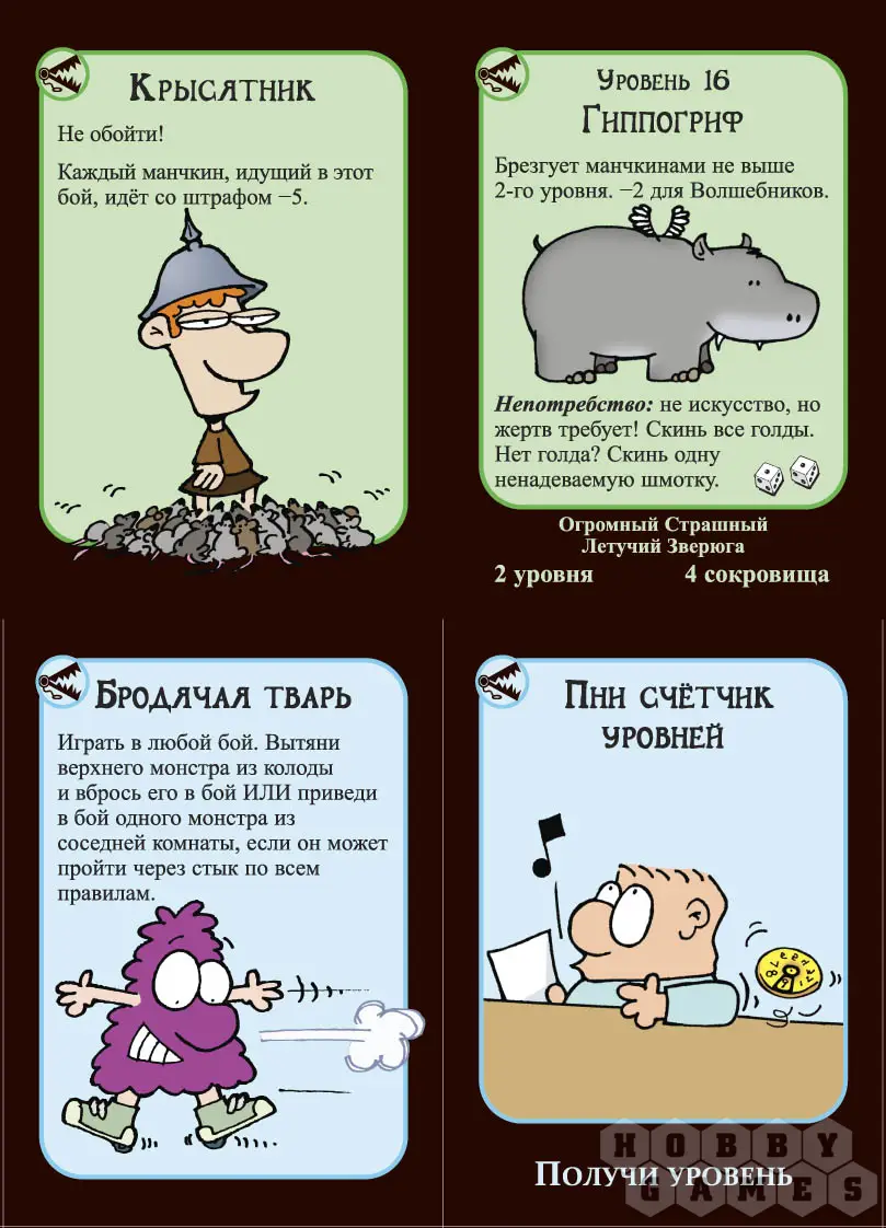 Итак, настольная игра "Манчкин" - это ролевая игра по форме, пародия по содержанию. Манчкины игроков ходят по подземелью, вытаскивают на свет божий тамошних чудовищных обитателей и либо раскаиваются в этом, либо получают за победу новые уровни и сокровища. Исход каждого подобного приключения (боя, короче) зависит от того, кто с чем на бой вышел. У игрока это уровень и бонусы/штрафы от шмоток, класса, расы и проклятий. У монстра это уровень плюс карты-усилители и разовые шмотки. Откуда шмотки у монстра? В вашем бою могут принять участие и завистливые соперники: они могут помогать монстру и ослаблять вас. Поэтому, хотя в "Манчкин" и можно играть вдвоём, наберите на матч побольше народу: на руках будет больше проклятий, усилителей и зелий, которыми так легко изменить баланс сил в бою в любую сторону, и бдительные завистники не дадут никому из вас выйти в единоличные лидеры гонки к 10му победному уровню.