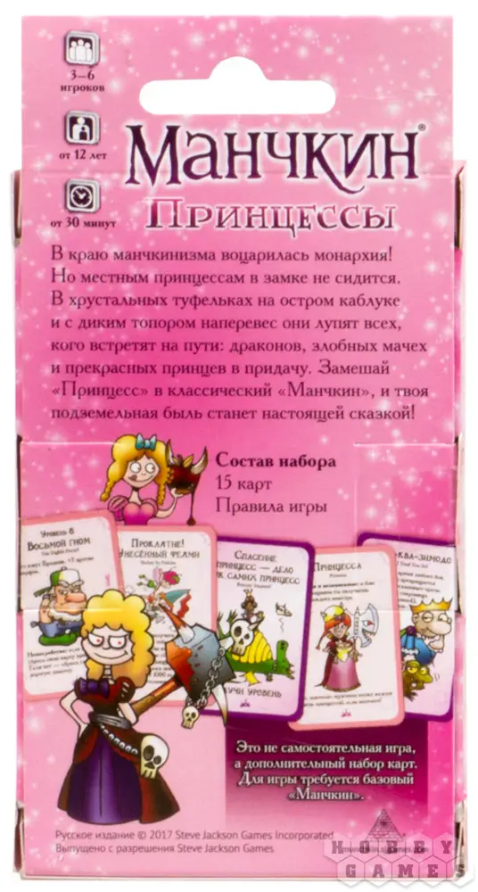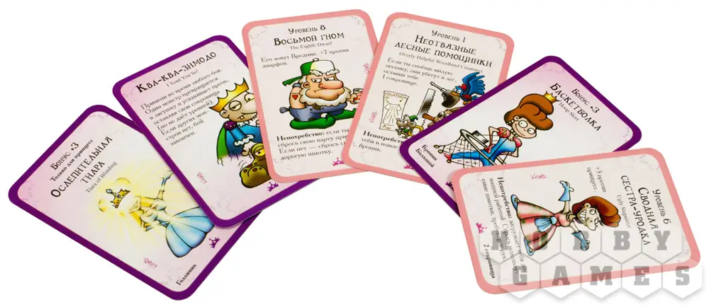 Внутри вы найдёте 15 новых карт – 9 карт дверей и 6 карт сокровищ. Помимо новых монстров ("Сводная сестра-уродка") и шмоток ("Баскетболка"), в комплекте вы найдёте две карты принцесс. Эти карты не считают ни за класс, ни за расу, поэтому принцессой сможет стать кто угодно. Помимо статуса, обретённого величия и невероятной красоты, игроки получают новую способность – в бою без помощников принцесски получают +3 за каждого монстра в бою, что весьма неплохо.