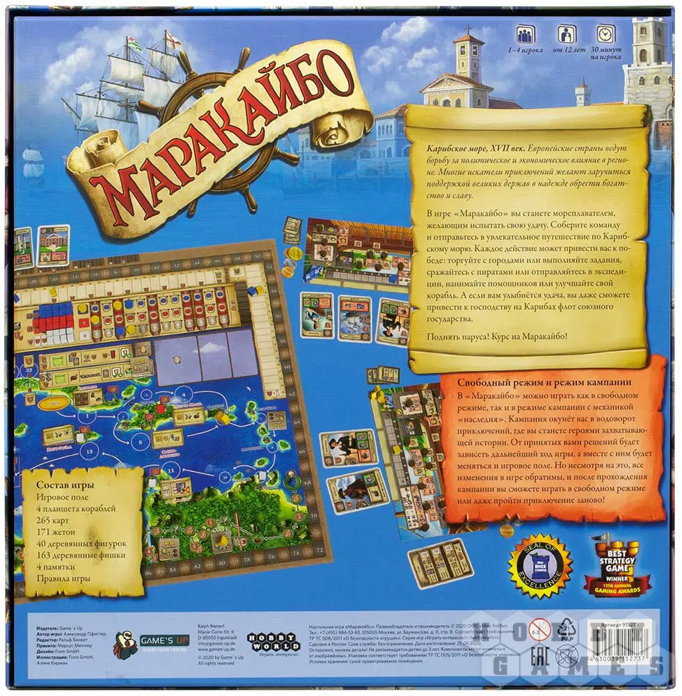 "Маракайбо" – это комплексная настольная игра, созданная именитым геймдизайнером стратегических игр Александром Пфистером. Действие игры перенесёт вас в самый разгар борьбы за Карибские острова, происходившей в XVII веке. Три великие державы: Англия, Франция и Испания пытаются получить контроль над потоком товаров и услуг этого богатого региона, и именно вы и ваша верная команда сможет помочь им в этом. Торгуйте с городами или выполняйте задания, сражайтесь с пиратами или отправляйтесь в экспедиции, нанимайте помощников или улучшайте свой корабль – вам открыто множество путей к победе!