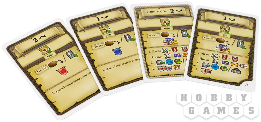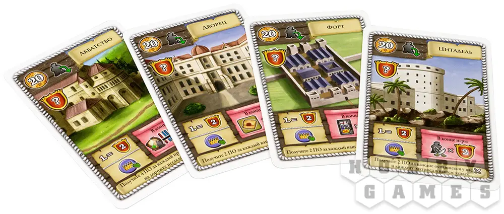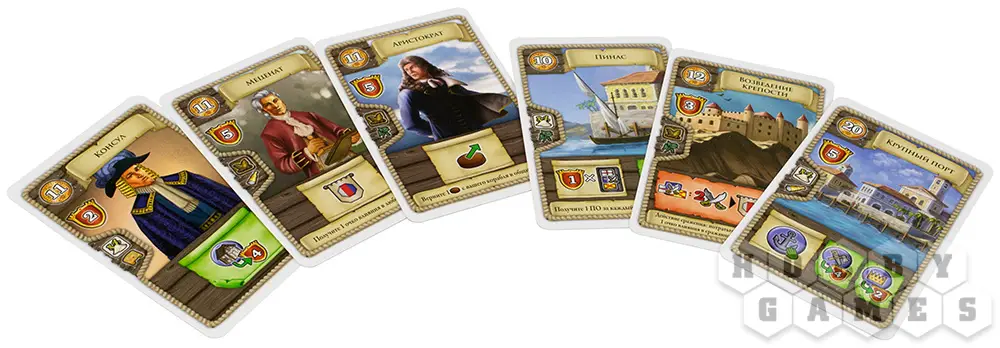 Добор Карт. Возьмите карты из колоды путешествия, пока не достигнете предела карт на руке. Со временем вы сможете увеличить свой предел карт. Вместо карт из колоды у вас есть возможность брать карты из области открытых карт, однако за каждую такую карту необходимо заплатить 1 дублон.