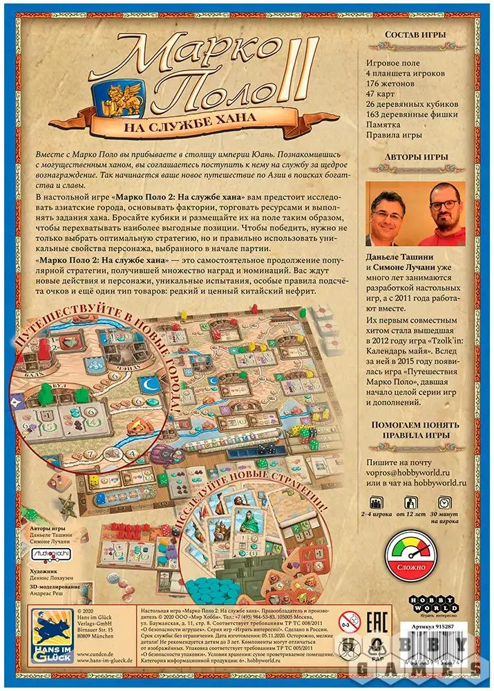 В настольной игре «Марко Поло 2: На службе хана» вам предстоит исследовать азиатские города, основывать фактории, торговать ресурсами и выполнять задания хана. Бросайте кубики и размещайте их на поле таким образом, чтобы перехватывать наиболее выгодные позиции. Чтобы победить, нужно не только выбрать оптимальную стратегию, но и правильно использовать уникальные свойства персонажа, выбранного в начале партии.