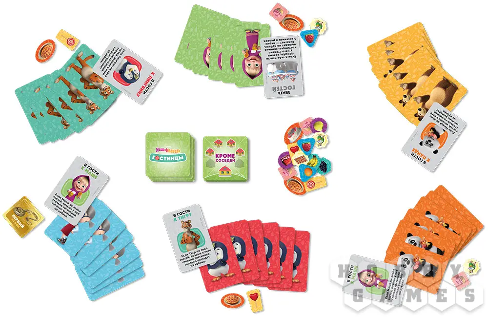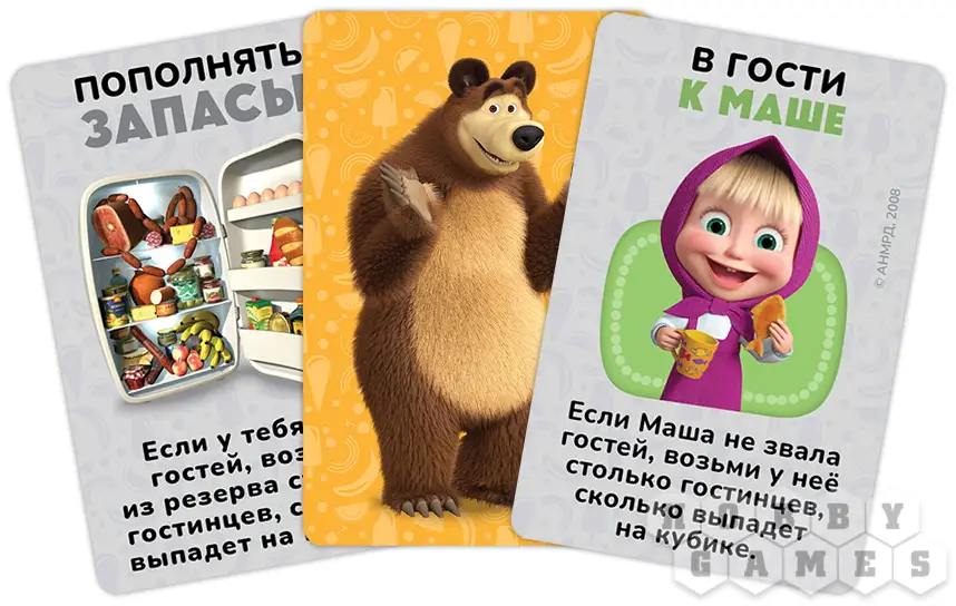 Вы будете играть за одного из персонажей мультика "Маша и Медведь". У вас на руках будут карты этого персонажа, которые позволят сходить к кому-то в гости, устроить чаепитие у себя или пополнить запасы сладостей.