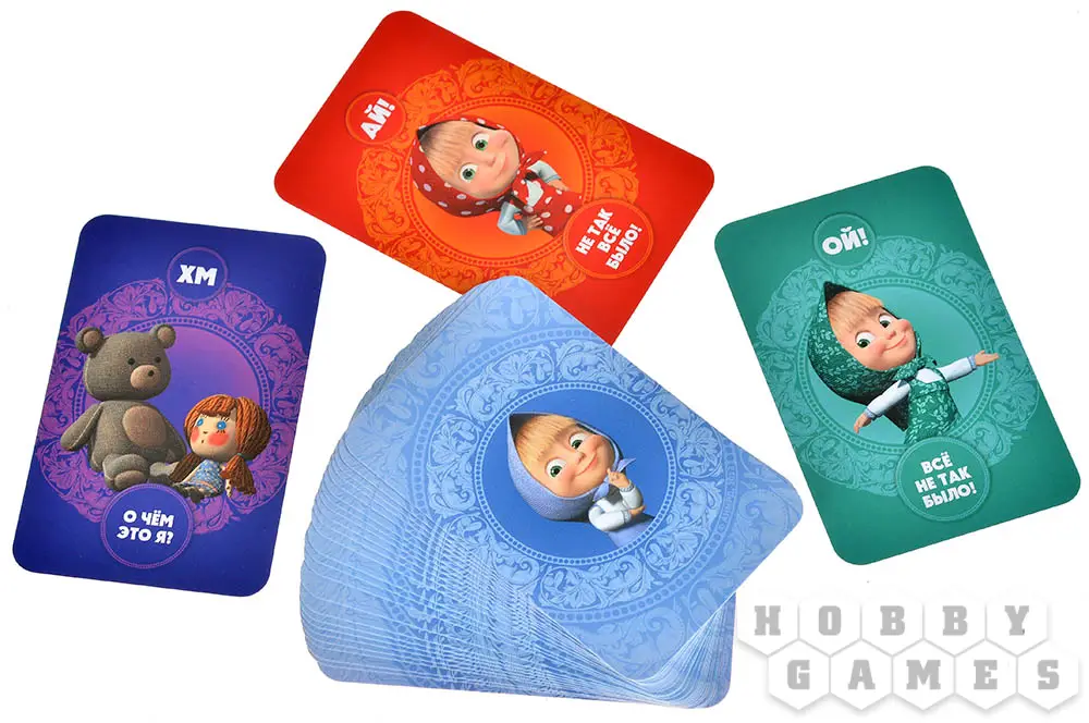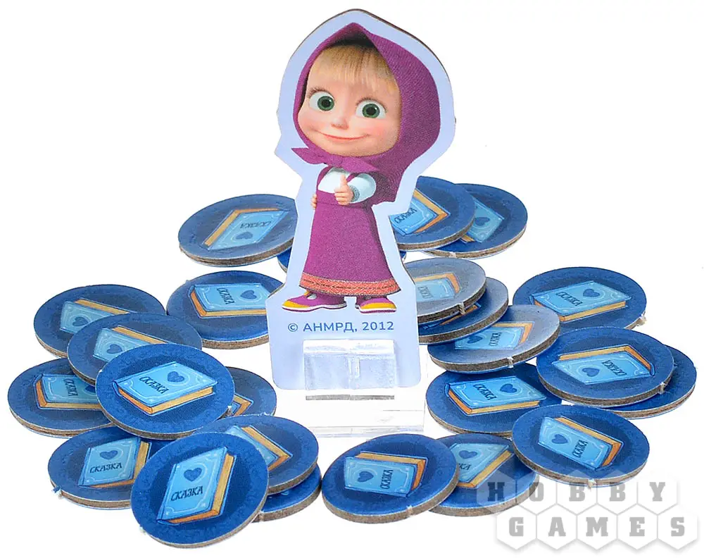 Перемешайте все карты сказок и забывательные карты, создавая одну большую, волшебную колоду. 20 карт отправьте в заколдованную колоду, а потом раздайте каждому игроку по одной карте. Если кому-то досталась забывательная карта – не беда! Пусть она вернётся в колоду, а на её место прилетит новая карта. Положите рядом жетоны сказочников, а ещё выберите первого игрока – пусть это будет, например, тот, кто последним смотрел мультик про Машу.