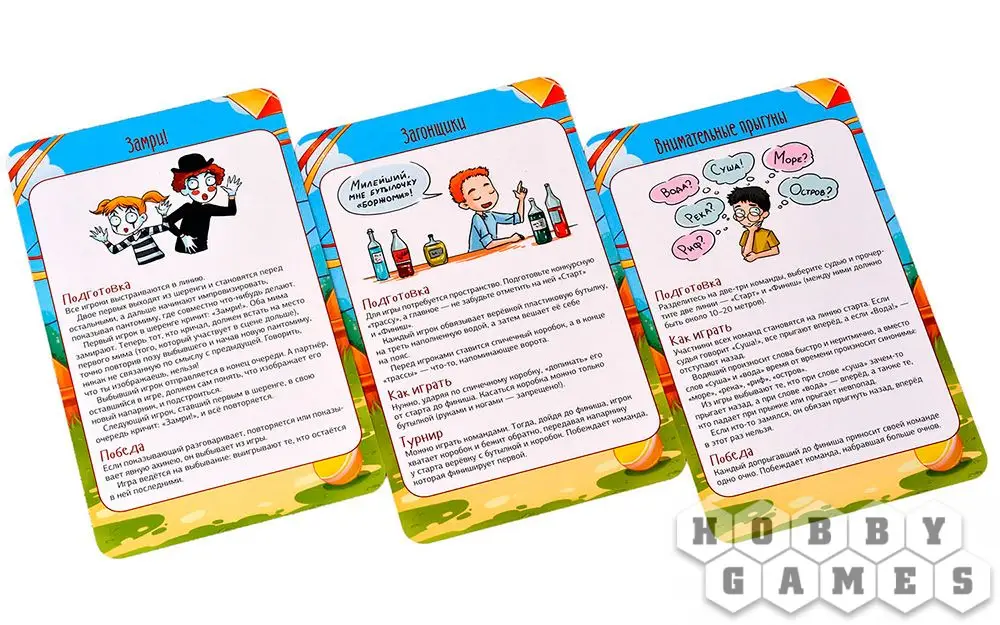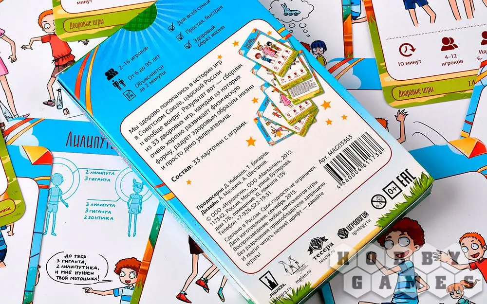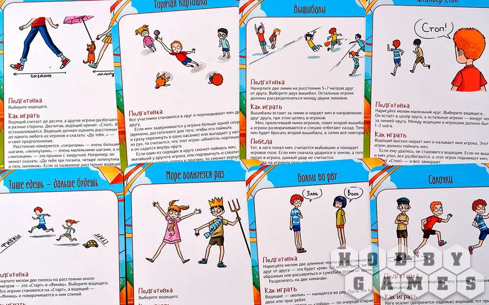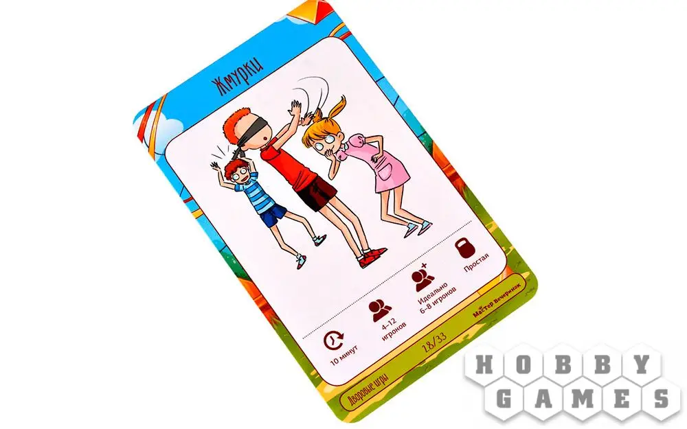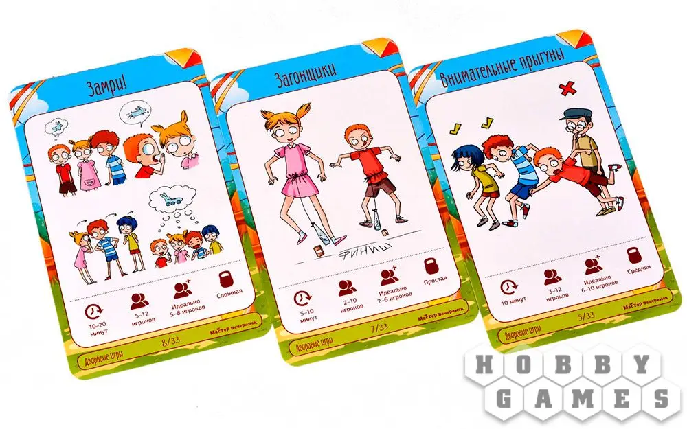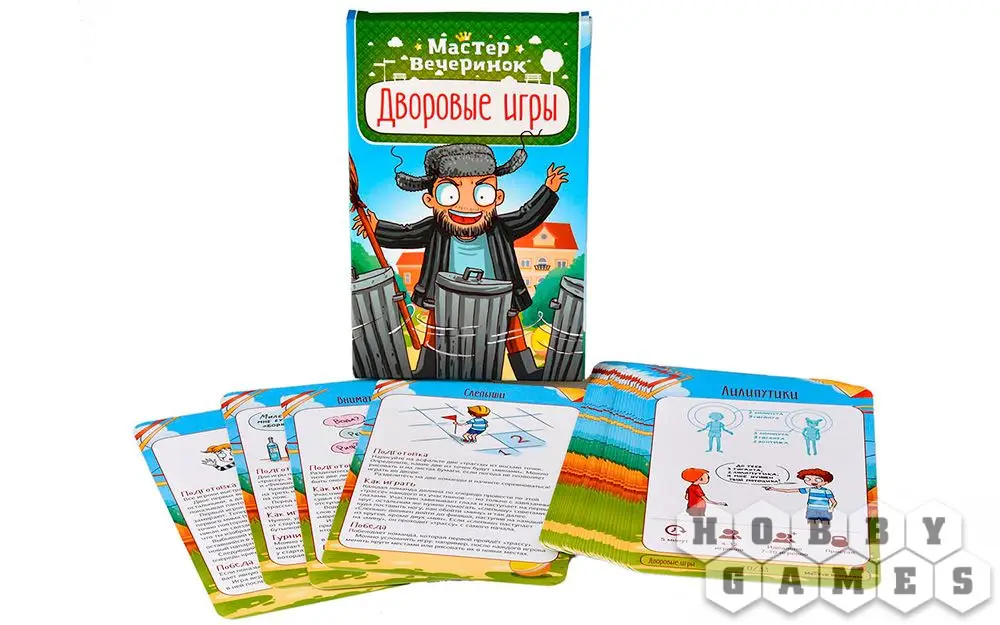 В коробке с настольной игрой "Мастер вечеринок: Дворовые игры" вы найдёте 33 карты с подробным описанием подвижных игр – что потребуется для начала игры, как именно играть и каковы условия победы. "Горячая картошка", "Вышибалы", "Море волнуется раз", "Загонщики", "Внимательные прыгуны" и многие-многие другие развлечения собраны здесь! Возьмите игру с собой на пикник или на дачу и увлекательно проведите время с детьми, ведь, как известно, в каждом взрослом живёт ребёнок, а это значит, вас ждёт море веселья!