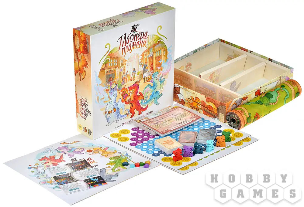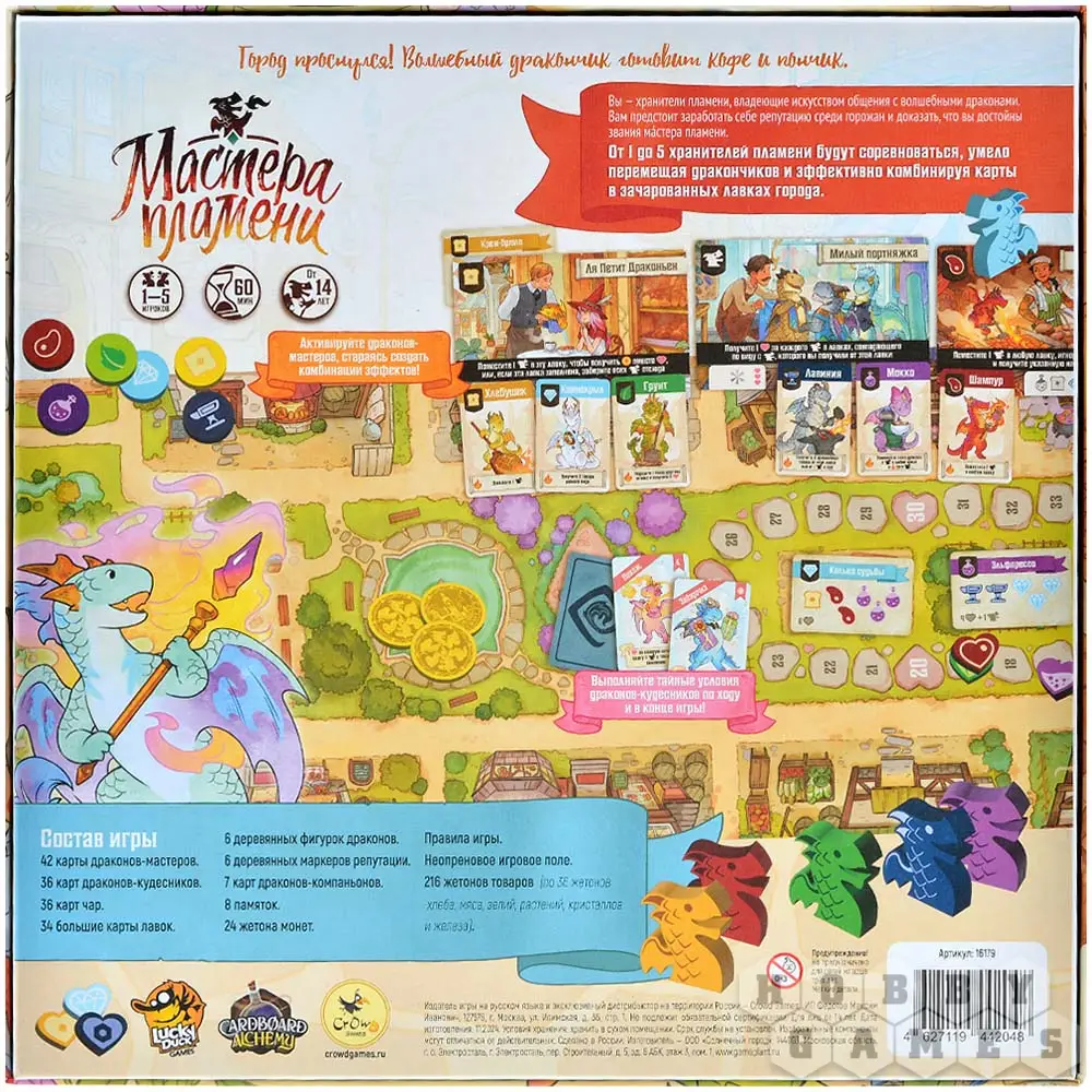 "Мастера пламени" – это уютная стратегическая игра для всей семьи. Вам предстоит стать покровителем драконов-ремесленников, подбирать им идеальные лавочки и помогать творить чудеса. Для этого нужно будет размещать своих хвостато-крылатых подопечных в мастерских, активировать их уникальные способности и накладывать заклинания, чтобы получать ценные ресурсы и повышать свою репутацию. Каждый ход – это выбор: собрать награды здесь или сейчас или вложить их в дальнейшее развитие, чтобы создать ещё более мощную комбинацию?