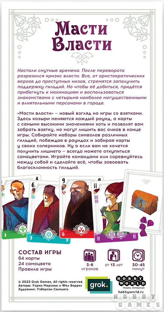 "Масти власти" – это карточная настольная игра, открывающая взгляд на игры со взятками под новым углом! Козыри меняются каждый раунд, а карты с самыми высокими рангами не всегда приносят пользу: да, они позволят вам забрать взятку, но ближе к концу игры могут лишить вас победных очков. Собирайте наборы символов различных гильдий, побеждая своих соперников и забирая у них карты. А если переживаете, что можете получить лишнего, то всегда можно откупиться самоцветами! Играйте, объединившись в команды, или соревнуйтесь каждый сам за себя. Приложите все усилия, чтобы завоевать благосклонность гильдий.