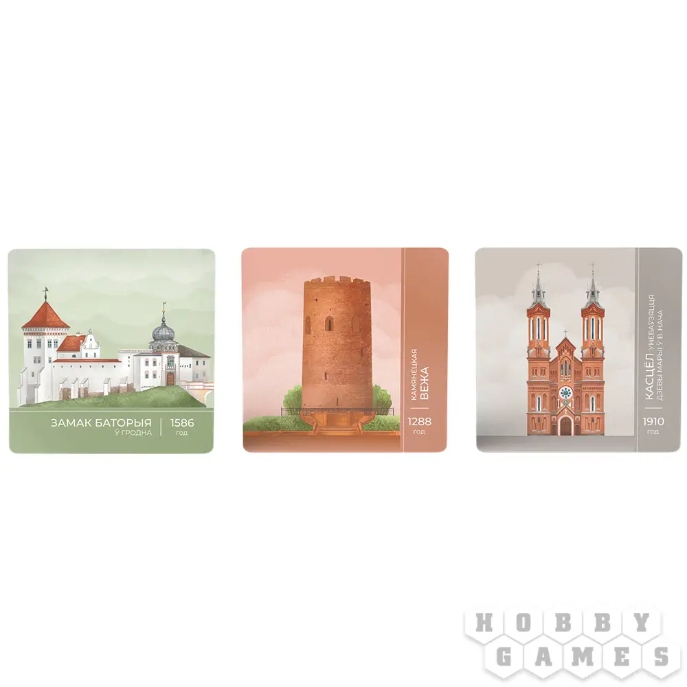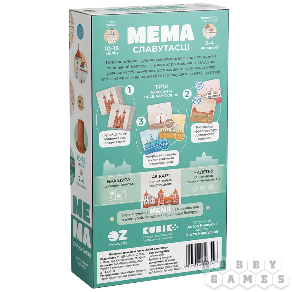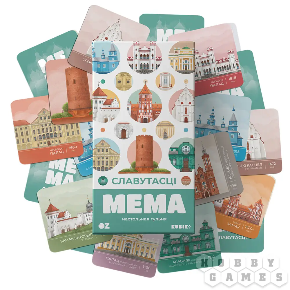 "Мема. Славутасці" – это настольная игра, которая знакомит с архитектурным наследием Беларуси через три режима: классический поиск пар, вариант "Инфраструктура" с дополнительными правилами и командная "Хронология", где нужно раскладывать достопримечательности в хронологическом порядке. Каждая карточка – это история известного здания, а прилагающийся буклет раскрывает интересные факты, превращая игру в познавательное путешествие.