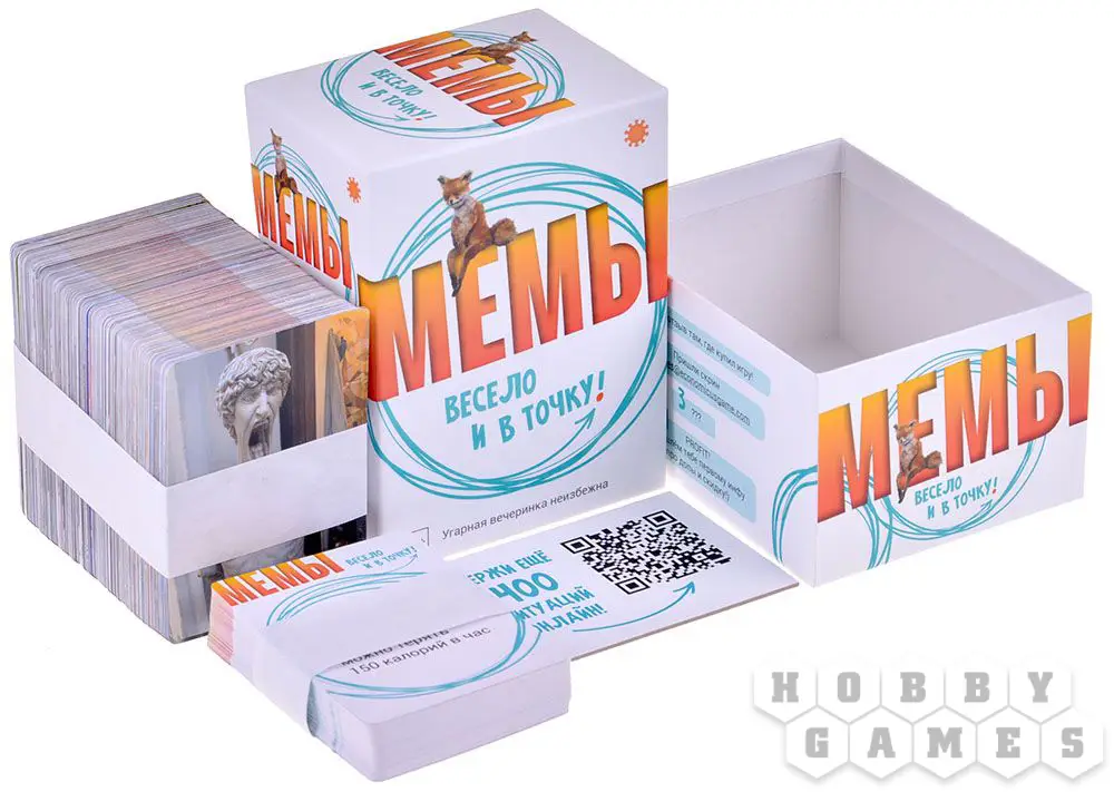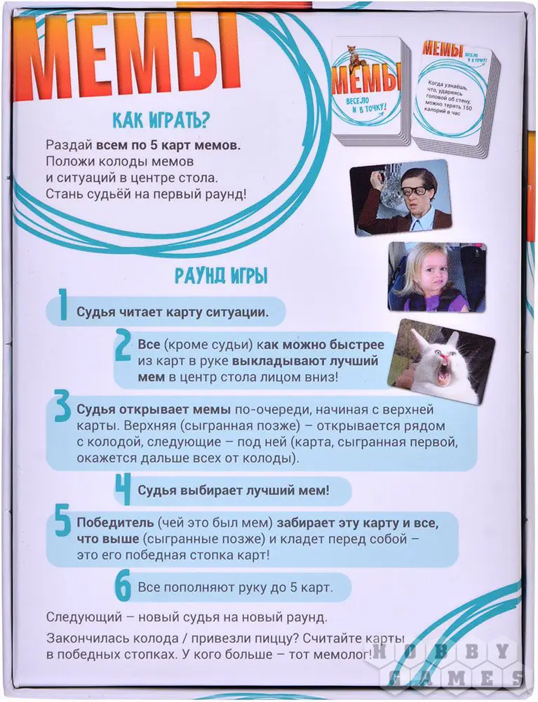 Правила игры "Мемы: Весело и в точку!" настолько просты, что объяснены прямо на коробке! Каждый раунд ведущий зачитывает одну ситуацию – она может быть смешной, злободневной, неловкой или какой-либо ещё. Следом каждый игрок должен выложить из руки по одной карте мема, который, согласно его мнению, подходит для озвученной ситуации. Когда игроки закончат, ведущий выбирает лучший мем, а его автор получает часть оставшихся карточек в качестве трофеев. Тот, у кого стопка трофеев в конце игры окажется наиболее внушительной, получает почётное звание главного мемолога вашей тусовки!
