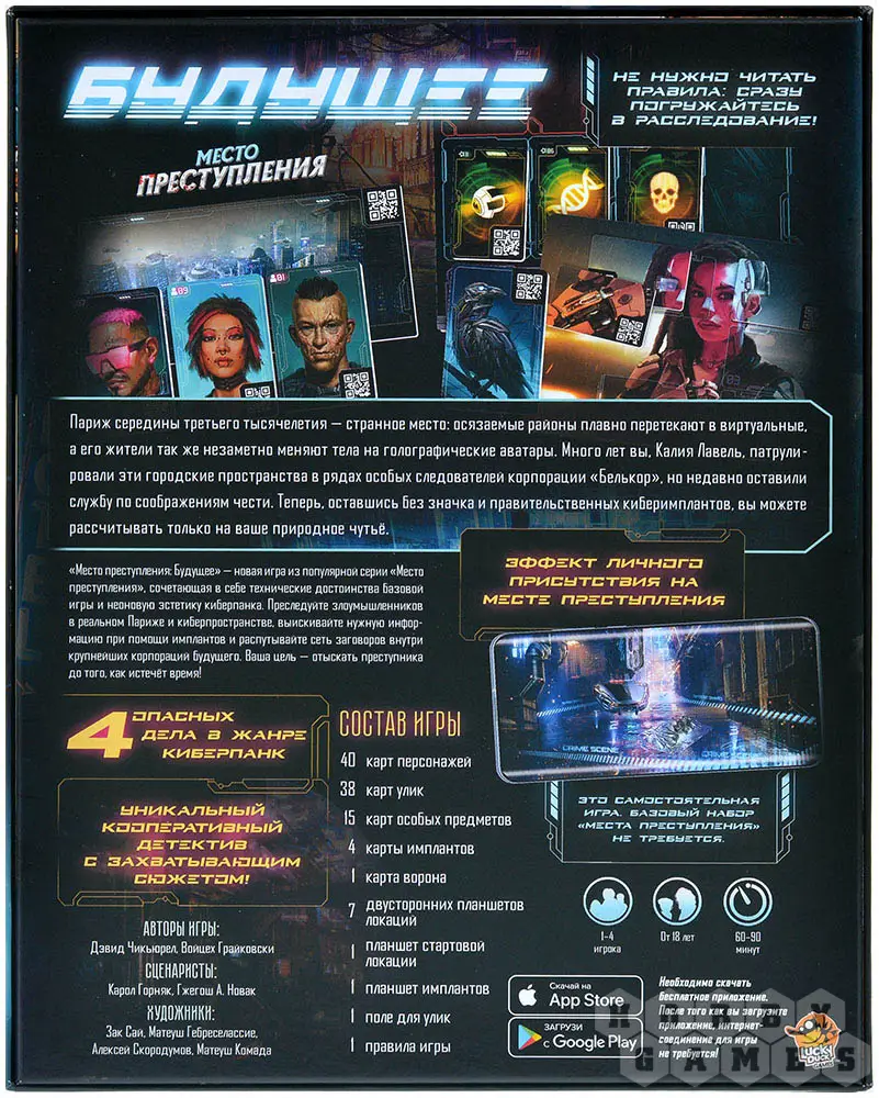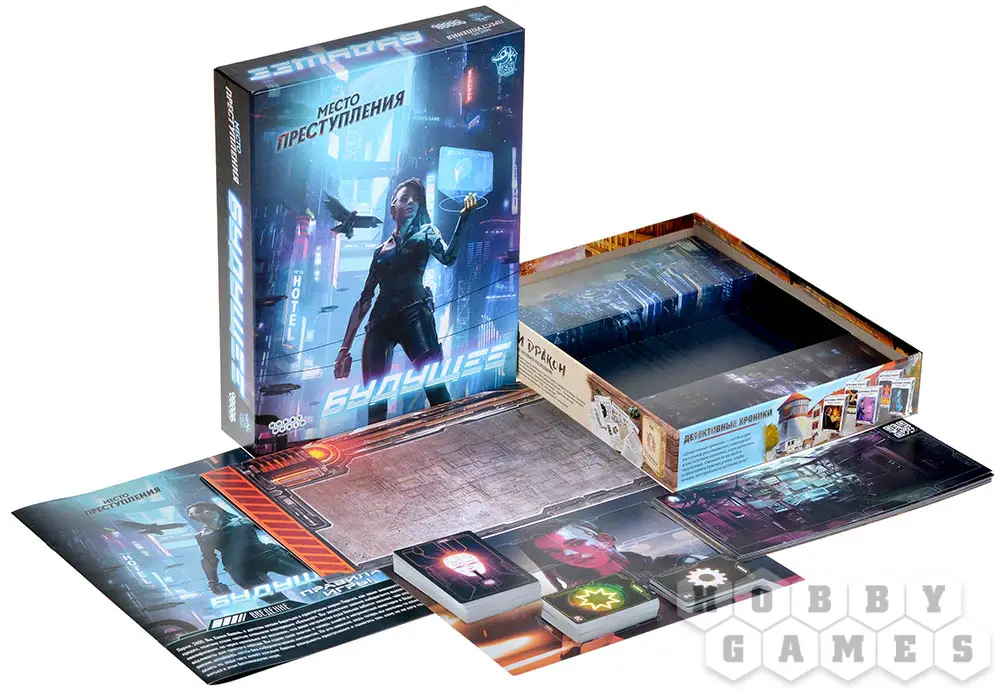 Настолка "Место преступления: Будущее" – новинка из серии игр “Место преступления” в стиле киберпанк. Охотьтесь на преступников в реальном и виртуальном Париже, при помощи имплантов находите нужную вам информацию и раскрывайте заговоры корпораций. Основная задача проста: найти преступника, пока время ещё не истекло!