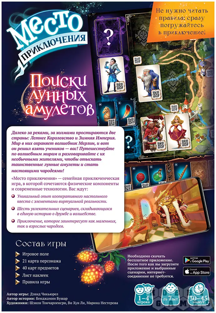 "Место приключения: Поиски лунных амулетов" – это увлекательное приключение для всей семьи, в котором гармонируют традиционные игровые компоненты и новейшие технологии. Вас ожидают: