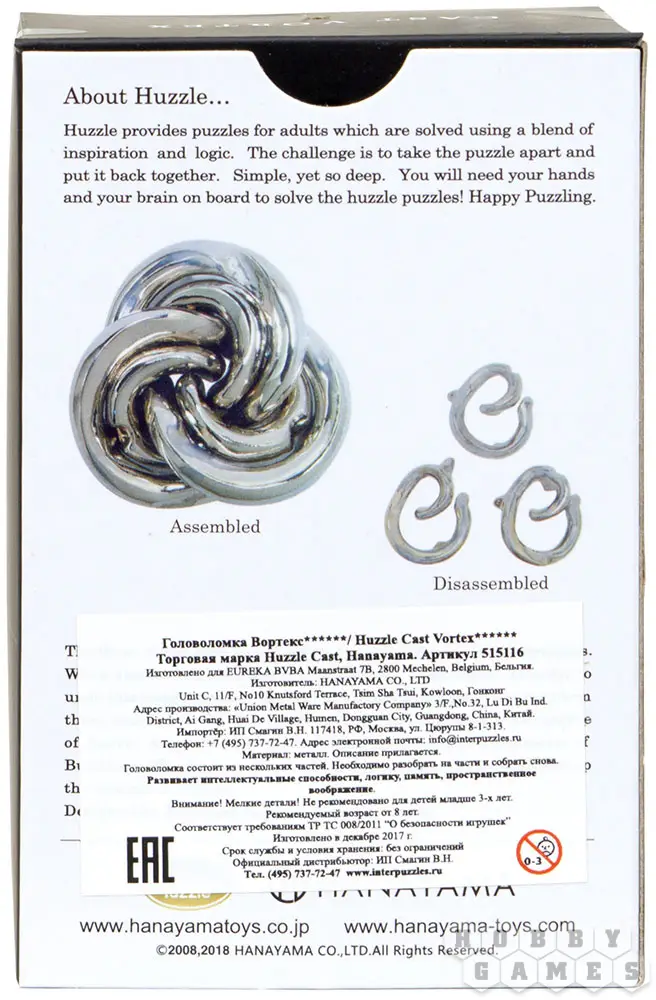 Линейка Huzzle Cast от японской компании Hanayama – это качественные металлические головоломки высокого уровня сложности, которые могут послужить отличным подарком как увлечённому фанату головоломок, так и просто человеку с пытливым умом. Чтобы решить головоломку, вам надо сначала разобрать её, а потом собрать. Причудливые формы и конструкции тщательно продуманы профессиональными создателями головоломок из стран всего мира и опираются на математические расчёты и законы физики.