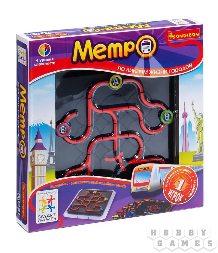 Ты сможешь создать собственный метрополитен в твоем любимом городе, и тебе не придется копать для этого землю. Расположи детали железнодорожной колеи на игровом поле таким образом, чтобы поезд метро смог проследовать через все станции, указанные в карточке с заданием. Схема движения поездов в метро разрабатывается с учетом определенных правил. Назови станции, как тебе захочется, и не сбейся с маршрута! В процессе игры развивается логика и пространственное мышление. Компактная упаковка позволит брать эту игру с собой в дорогу. Удобная игровая доска с отделением для хранения карточек с заданиями. Идеальная дорожная игра для детей и взрослых, играть в которую можно и в автомобиле, и в метро, и на поезде, и на природе!