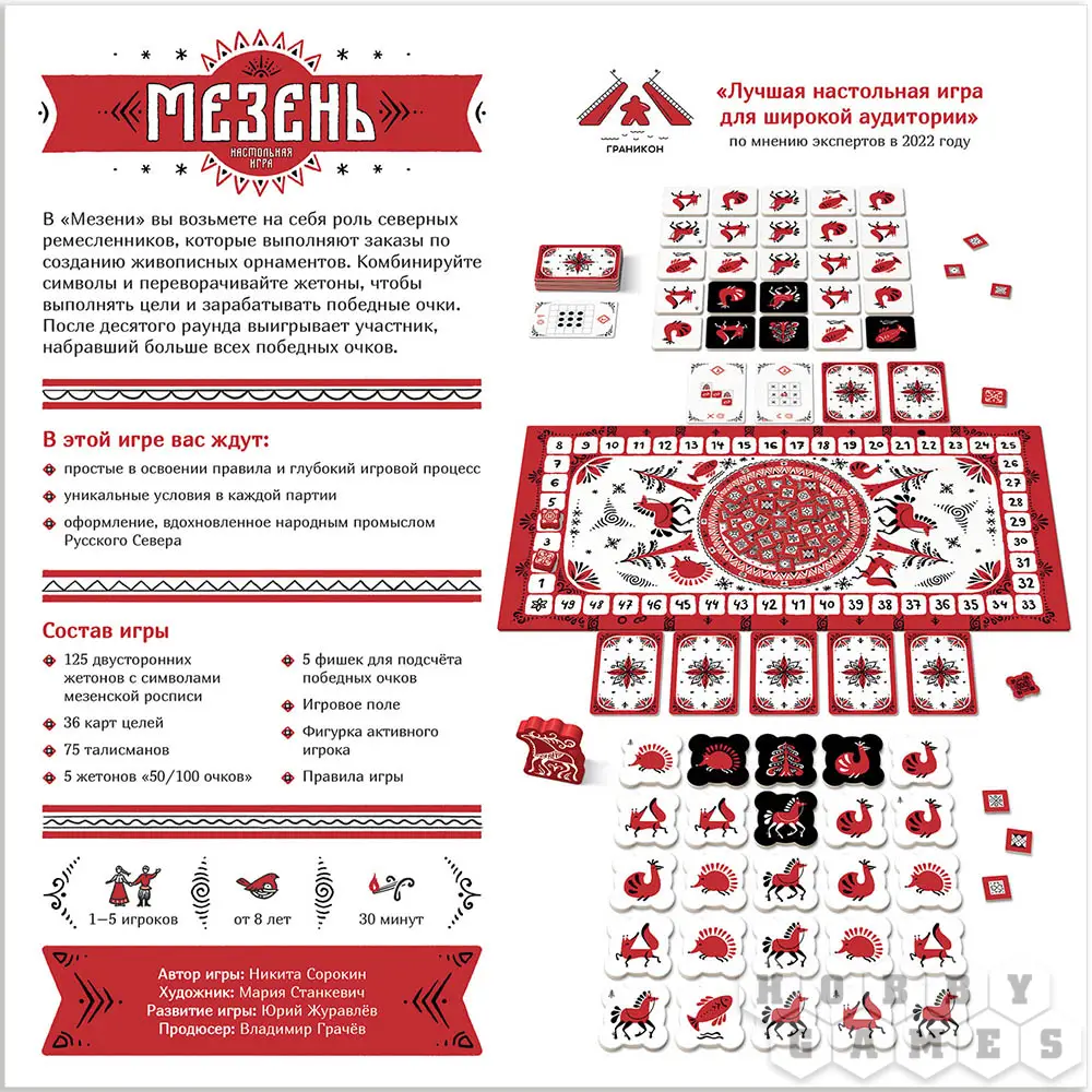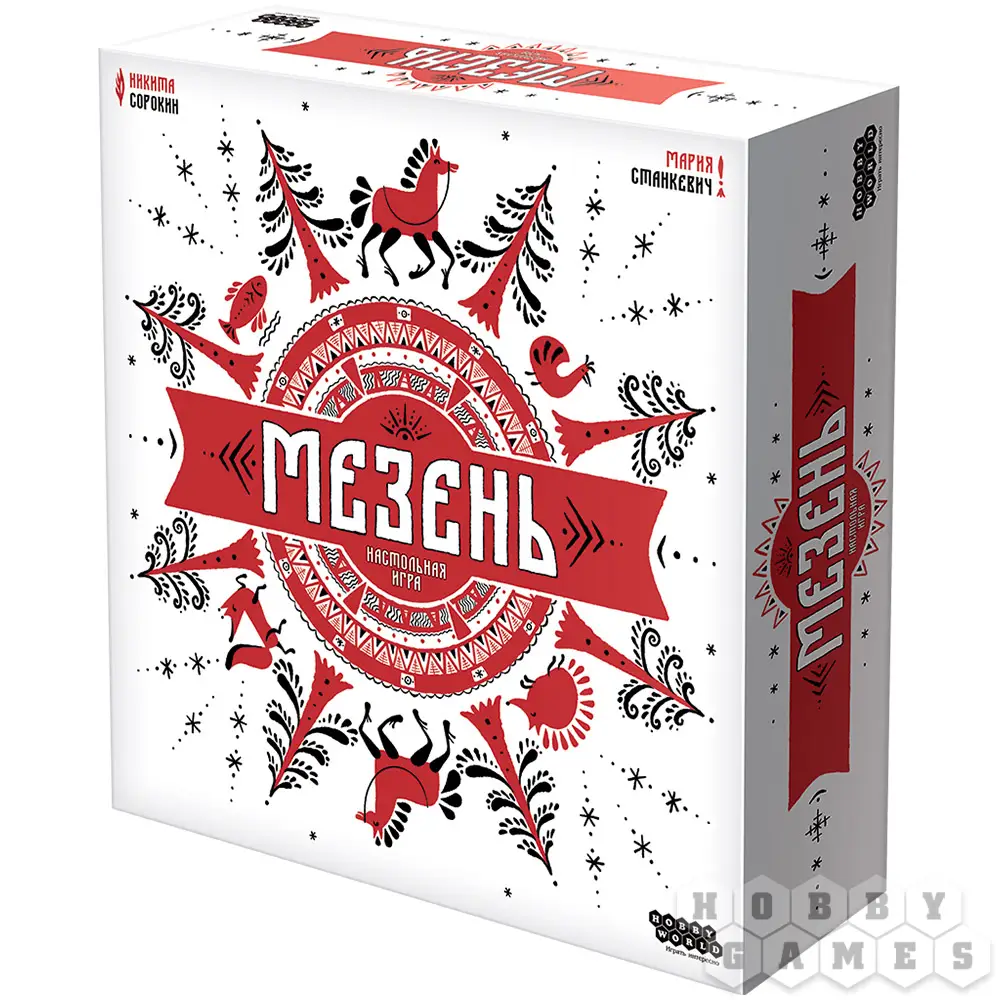 Игра "Мезень" основана на культурных мотивах и стиле мезенской росписи, что получило отражение во всех компонентах – от крат до поля и жетонов. Игроки возьмут роли северных ремесленников, что соревнуются в создании прекрасных орнаментов. Выполняя заказы из раунда в раунд, вы будете составлять комбинации из символов зверей, получать очки и использовать талисманы, чтобы стать самым известным мастером!