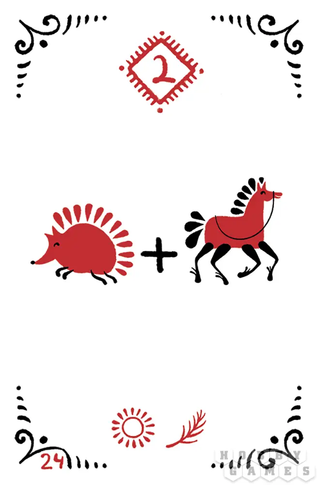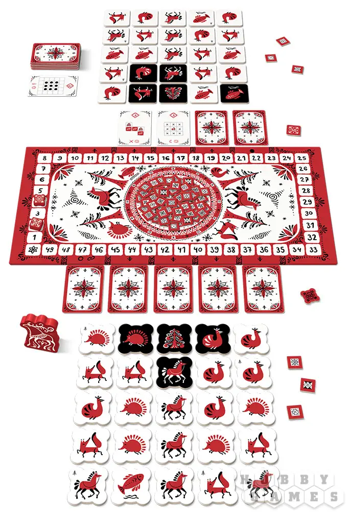 Каждый игрок получает набор из 25 жетонов с различными символами – от ежей до лошадей. Из данных жетонов случайным образом нужно выложить квадрат 5х5 – это орнамент игрока. Следом нужно открыть первые карты целей – с каждым раундом они меняются. Выдайте одному из участников фигурку активного игрока. Далее игроки получают по 5 талисманов – и можно начинать.