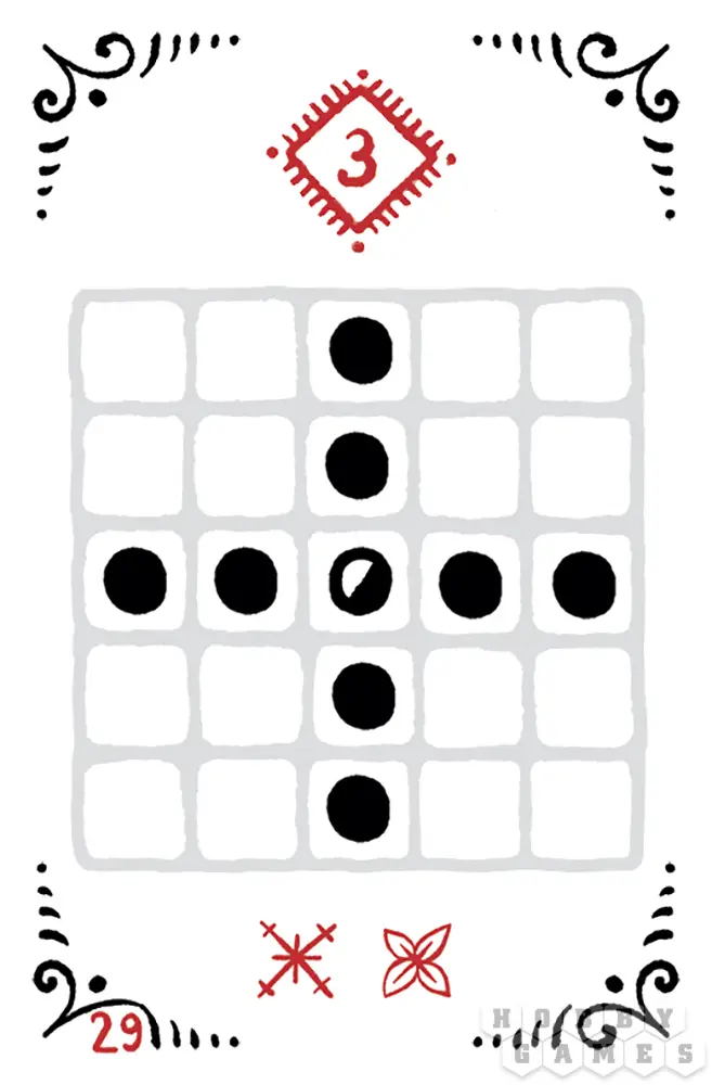 Цели могут быть самыми разными – например, от вас может потребоваться разместить символ определённого типа в определённом месте на поле. Либо, например, вы можете получать очки за количество "чёрных" жетонов в вашем орнаменте.