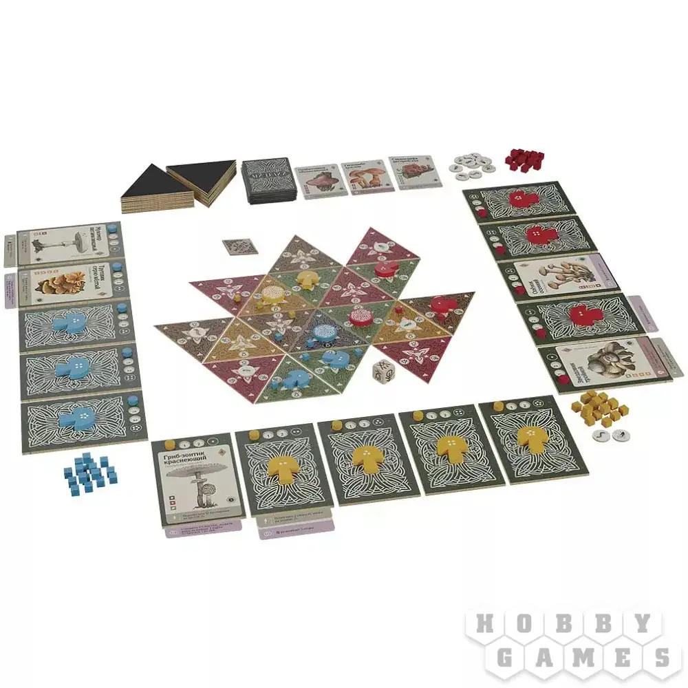 Игровой процесс прост в освоении: каждый игрок совершает по два действия за ход. Наберите в свой кузовок побольше победных очков, распространяя свои грибные владения и осваивая всевозможные типы грибов. В игре сочетаются яркий дизайн, вдохновлённый энциклопедиями и этническими узорами, и глубокие стратегические элементы, создающие вариативность и увлекательные тактические сражения. "Мицелий" рассчитан на 1–4 игроков и подойдёт как для любителей спокойных стратегий, так и для тех, кто готов к неожиданным поворотам и ожесточённой борьбе за территорию.