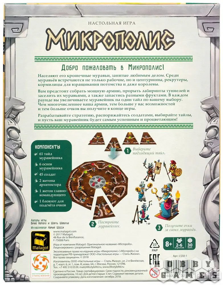 Постройте настоящую муравьиную ферму на своём столе с помощью настольной игры "Микрополис". Ферма не простая, а воинственная, ведь помимо обычных рабочих, в Ваших руках окажутся центурионы, которые станут костяком мощной захватнической армии. Даже королева муравьёв станет подвластна Вам, но придётся запастись кормильцами для взращивания будущих поколений муравьёв. Ройте лабиринты туннелей, заселяйте их новыми муравьями и запасайтесь питательными фруктами. Цель игры – построить огромный муравейник и получить за него как можно больше очков. Победные очки приносят: сильная армия, полные казармы и разные туннели.
