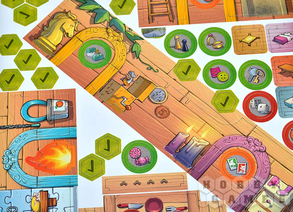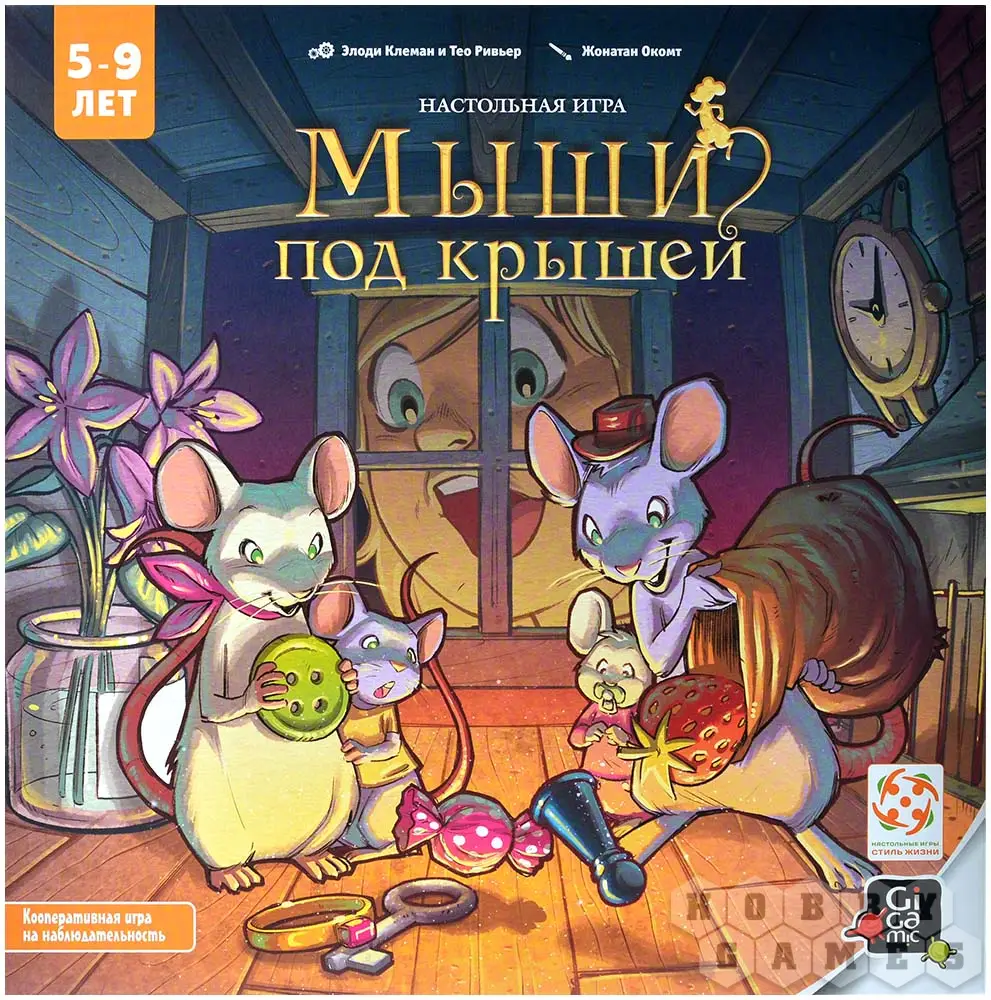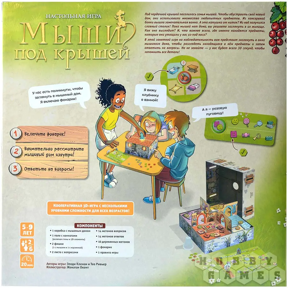 "Мыши под крышей" – это весёлая кооперативная игра на внимание и память для детей в возрасте от 5 до 9 лет. Она завораживает и привлекает к себе внимание уже на этапе подготовки: игровое поле представляет собой настоящий трёхмерный домик с небольшими окошками и четырьмя разными комнатами внутри. Игроки будут освещать домик фонариком (входит в комплект) через крышу, чтобы символы внутри комнат стали видны. А затем у них будет 30 секунд на то, чтобы рассмотреть домик в окошки и запомнить, какой предмет в какой комнате находится. После этого на специальный лист вопроса попарно помещаются жетоны предметов и комнат. Например, жетон с нитками лежит рядом с жетоном спальни, игроки должны ответить, был ли этот предмет в спальне на самом деле или нет. Чем больше правильных ответов дадут юные игроки, тем больше победных очков они получат.