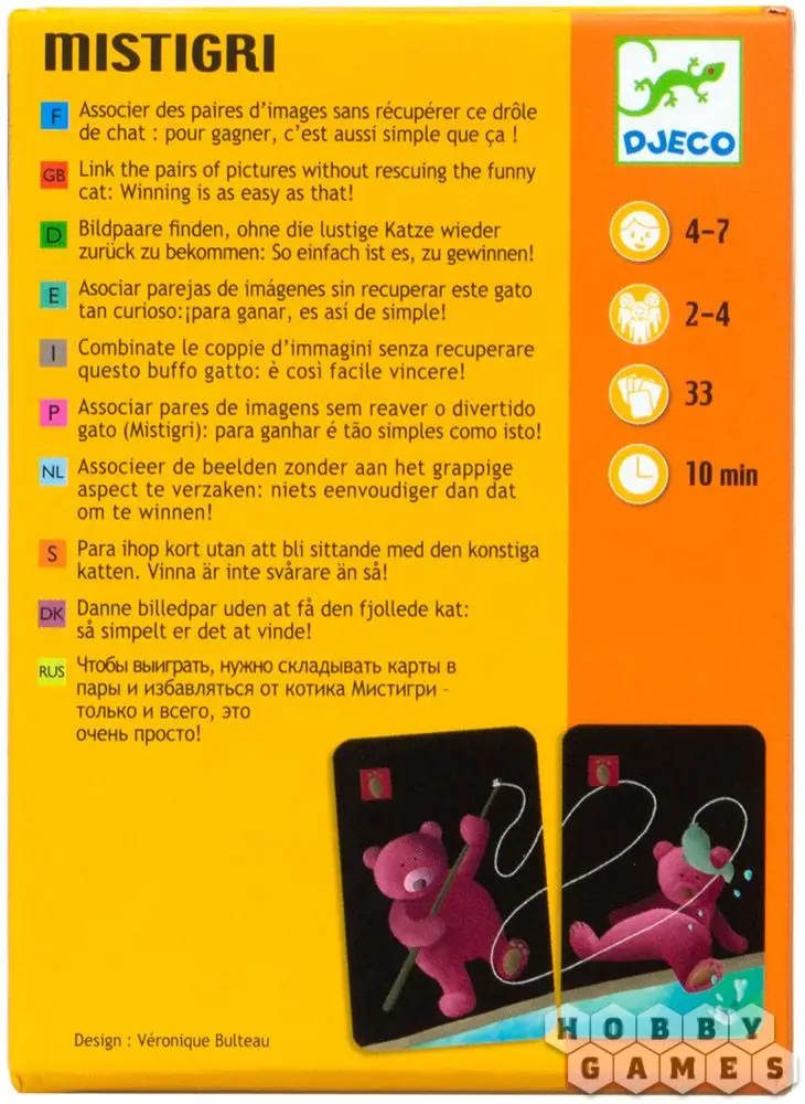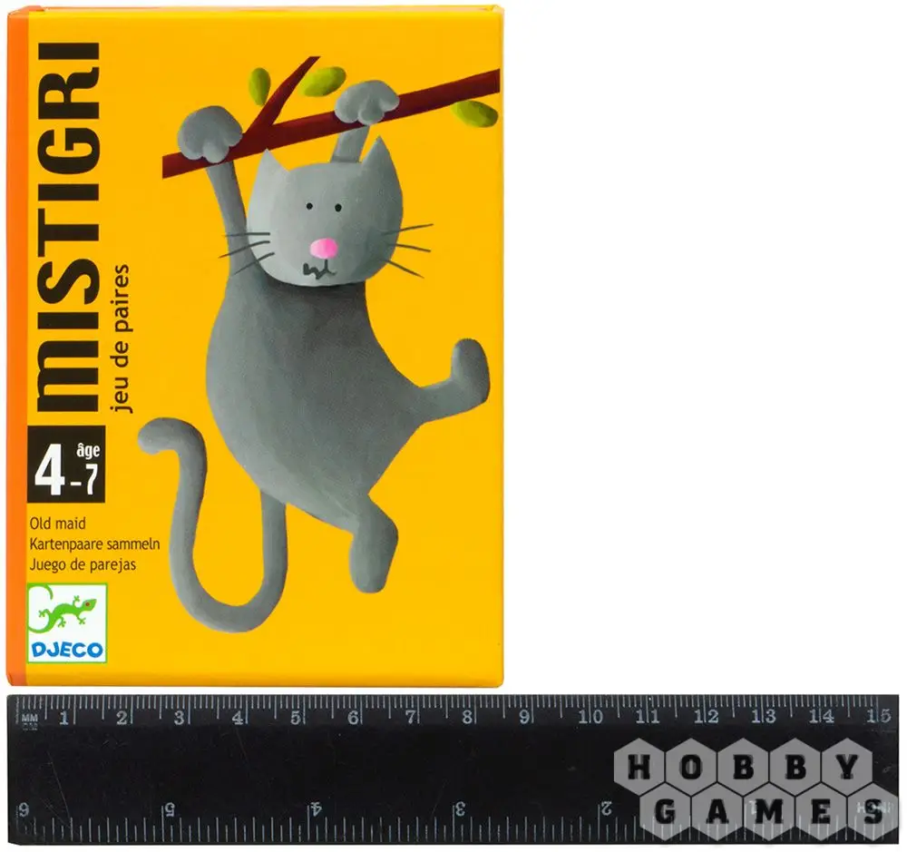 Детская карточная игра Mistigri для малышей от четырёх лет развивает наблюдательность и сообразительность. В игре нужно находить парные карточки, забирая одну из карт вслепую у соседа. У всех карт в игре есть пара, кроме карты с котиком Мистигри. Когда все карты будут разыграны, проигрывает тот, у кого на руках осталась эта карта.