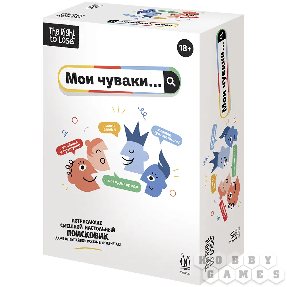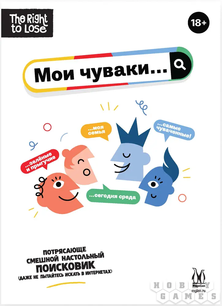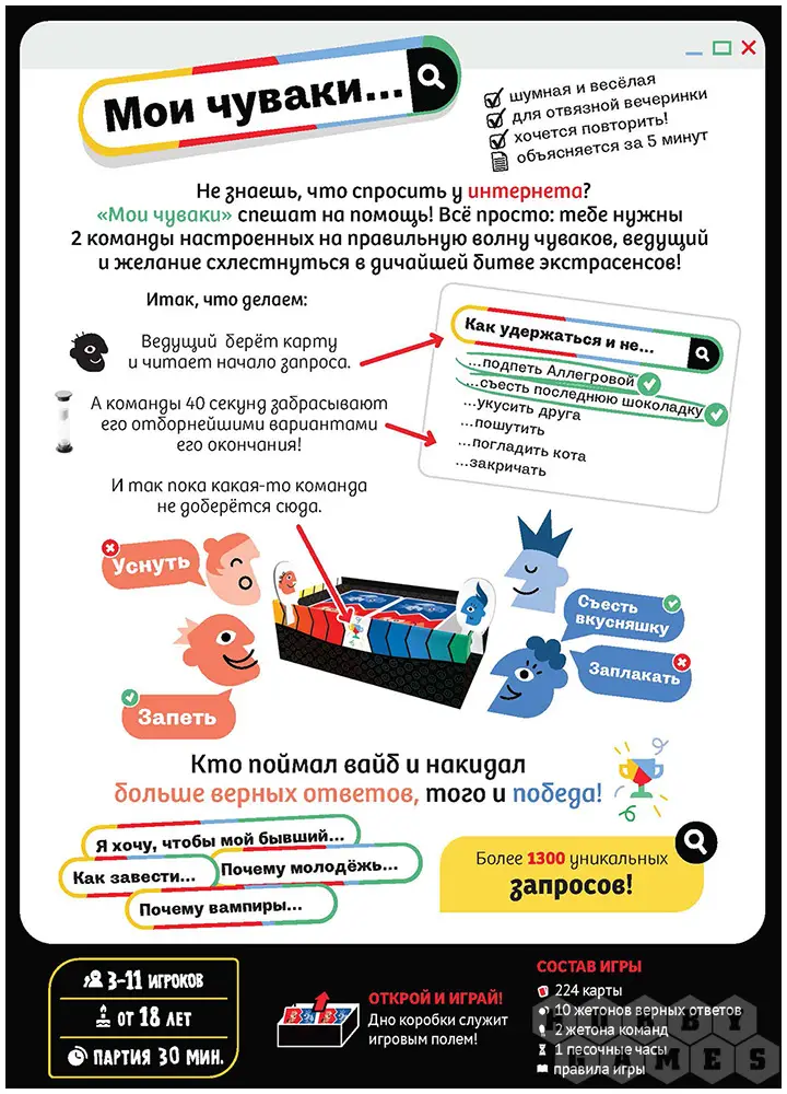 "Мои чуваки..." – это весёлая командная настолка для шумных и не очень компаний с максимально простыми правилами и тонной веселья. Какой бы компанией вы не собрались, каждый из вас что-нибудь да "гуглил", а значит вы точно готовы посоревноваться в знании людских мыслей и остроумии.